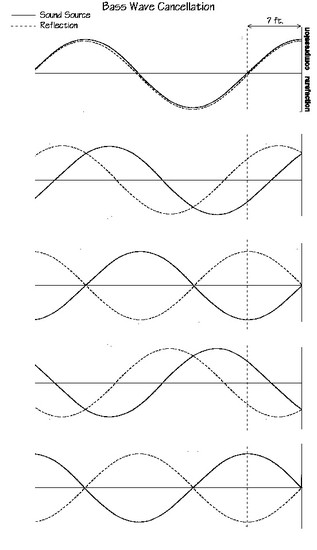 Let's take a moment to examine what happens when a speaker vibrates at 40 Hz in a room. Forty times per second, the speaker cone thrusts forward, causing a compression "peak" to travel across the room at the speed of sound. In between each such forward peak, the speaker cone travels backward, creating rarefaction "valleys." The distance between one compression peak and the next is one cycle, hence 40 peaks in a second equals 40 cycles per second (or Hz). Since sound travels through the air at a speed of approximately 1130 ft. per second, and 40 waves are going past any given point in a second, each wave cycle will be 28 ft. apart (1130 divided by 40 equals approximately 28). The distance between a peak and a valley will be half that: 14 ft. In a free field with no boundaries, you could stand at any reasonable distance from the speaker and hear flat, even bass, because the alternating peaks and valleys just keep going right past you, no matter where you stand. In a room, on the other hand, a wave will hit a wall or other surface, reverse direction, and then this reflected wave will mix with the source wave coming from the speakers. Inside, as opposed to outside, speakers sound louder due to these reflections, as volume is not lost to "outer space." The downside is that in some places in the room, for a given note, compression meets compression, amplifying that frequency (constructive interference), and in other parts of the room, compression meets rarefaction, canceling at that frequency (destructive interference). Exactly where in the room this happens varies with which bass note is sounding, and this is what drives engineers nuts as they try to decide on the bass level, EQ, and compression. The volume of any given bass note is completely dependent upon where you are in the room; conversely, the amount of bass you perceive at any given point in the room is dependent upon what note is being played.