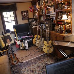 We recorded this project separately, in our four different home studios. My end was the hub of our recording quadrangle. Typically, I'd get everybody's parts, add my own, line them up, do some editing, export the PT session to a jump drive and bring it to Alex Smolinski at Wonder Wonder Sound in Milwaukee for some extra tracking, Kim Henry's background vocals and the final mix. We all produced different parts of the project and everyone grabbed the reins on different songs. The rule was that whoever took charge of whatever song had better beat that song up and take it's lunch money. At home, I recorded everything as simply as possible. I played a 66 Gretsch Rally, a 1970 ZB double neck pedal steel, and a custom 8 string Lap King Rodeo Grande steel guitar through a Peavey Delta Blues amp. No pedals. The microphone was a single SM57, which I ran through a pre-amp and from there to a M-Audio box and into Pro Tools. I played accordion, banjo, hammer dulcimer, some acoustic guitar and cornet live in the studio using the same microphone. My room is very alive and not at all soundproof. if you listen closely to some of our songs you can hear birds outside, trains and cars going by, neighbors talking, lawn mowers and other great distant sounds. I love that.