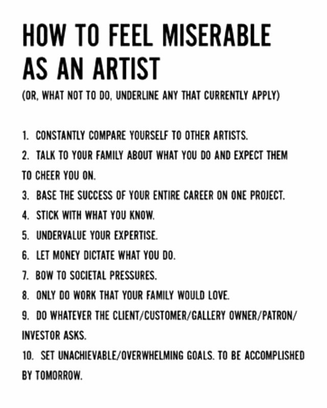 Artist/writer Keri Smith came up with this list some time back and it took on a life of its own. During a chat a client showed this to me as we were discussing being a musician and people that were "unhappy" with their lack of success. This sure seems to apply...