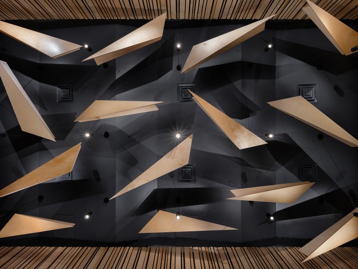 Additionally we developed a custom acoustic millwork design to diffuse the reverberation details of the room. We refer to it as the scatter system, as its purpose is to randomize (scatter) sound reflection angles in order to create a higher density in the character of the decay sound.