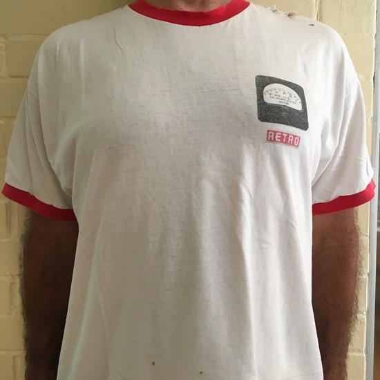 Phil Moore is the best and everything about Retro Instruments is the best. Their gear sounds amazing and never needs to be repaired, plus it looks cool, and so do their T-shirts! Bonus points for the white shirt with red neck and armbands!