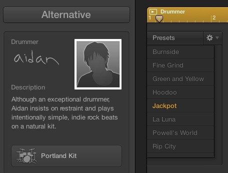 A reader just informed me that APPLE's recent Logic Pro X includes "Drummer", a virtual drummer plug-in. One of the virtual drummers is named "aidan", who apparently cannot find the CAPS key on his virtual MacBook. In Aidan's "Portland Kit" we find styles named with Portland, OR-specific titles, like "Powell's World" and "Burnside." Okay, whatever. But one of the styles is named "Jackpot." Now one might know that I've owned a studio in Portland named "Jackpot!" since 1997. And I've recorded many well-known "indie rock" records there. It also appears our virtual "Drummer" Aiden plays "indie rock beats."