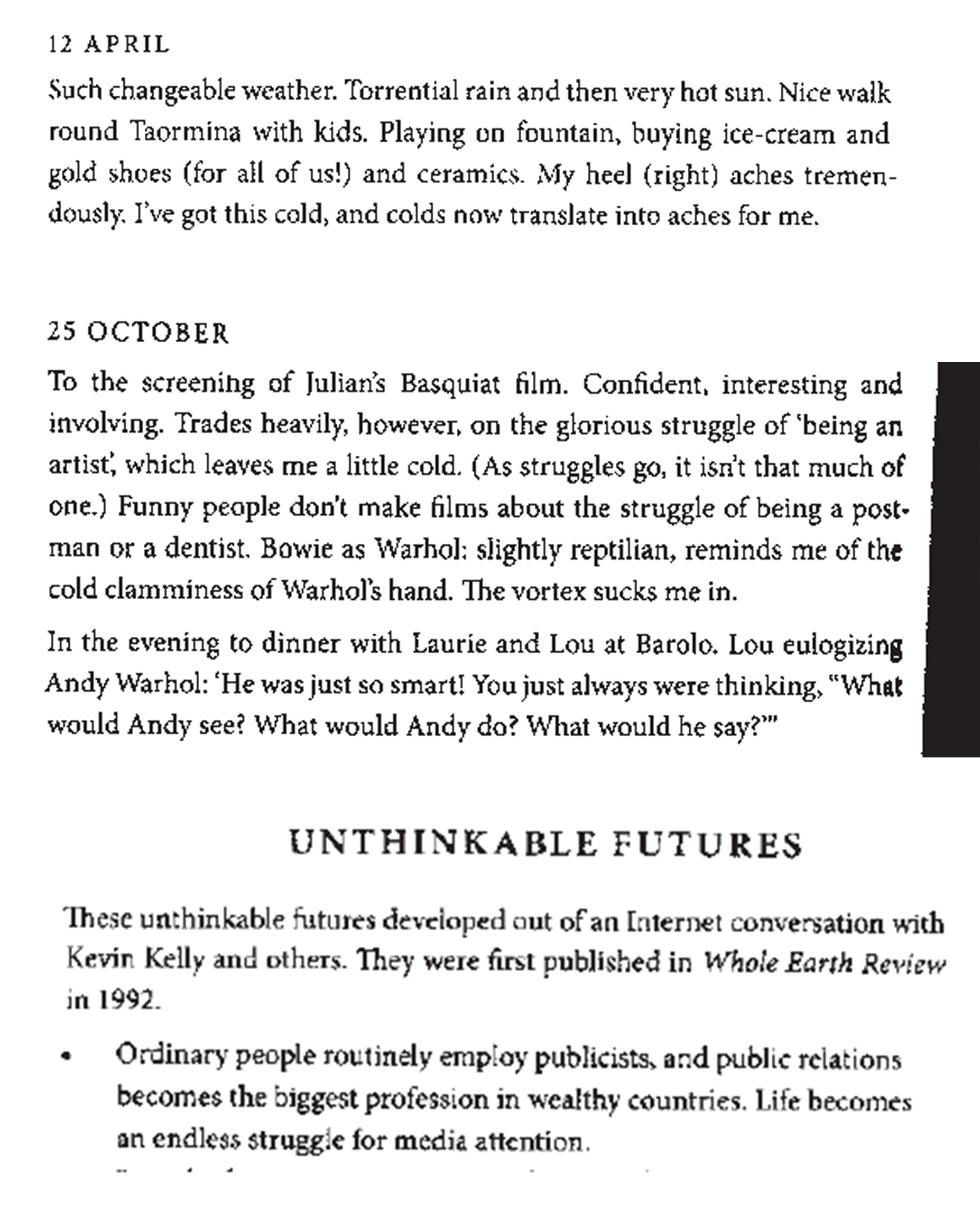 So, what we have here is a diary of every day of Eno’s life for one year in 1995.* Some days are rather ordinary while some are pretty exciting, but he’s always a keen observer of people and the world we live in, making it all fairly interesting. The appendices account for 25% of the book, and range from Eno’s treatise on ambient music to letters to friends and colleagues, and are all insightful.