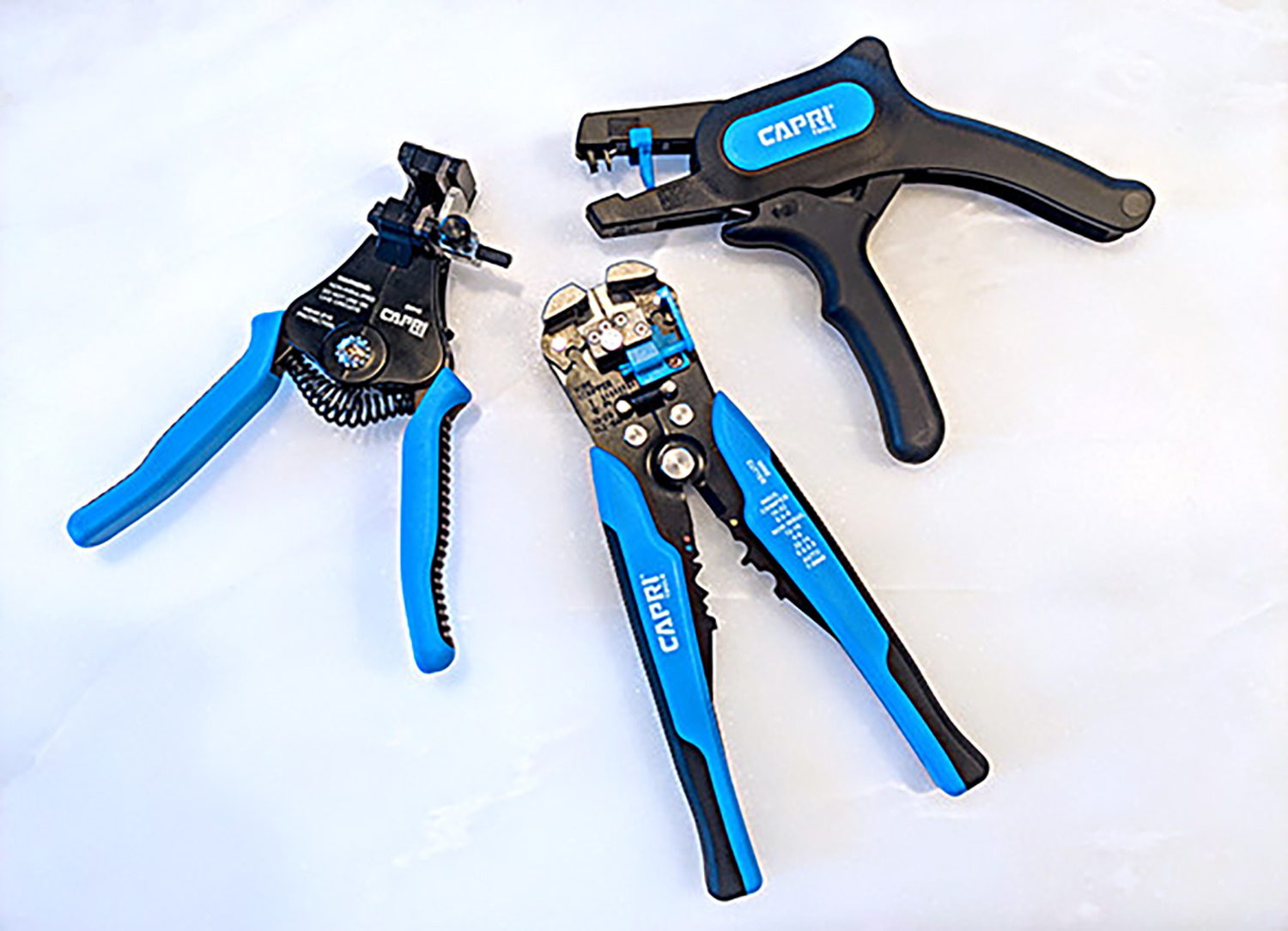 I still use the generic wire stripper that came in a $10 Radio Shack soldering kit that I purchased while in grade school. It consists of two rectangles of stamped steel, hinged together, with a single pair of V-shaped cutting slots in its jaws, and yellow rubber coating on its handles. A sliding nutted bolt used to control the cutting depth, while a loop of spring steel re-opened the jaws. I removed both features long ago, and instead, I squeeze until I feel the right amount of pressure to determine when I’ve cut through the wire’s insulation. Having used this stripper for decades, I feel that I have precise control over its cut. In fact, I prefer this cheap, vintage, generic tool over the many $10–$20 plier-style strippers that I own from the likes of Klein, Ideal, Milwaukee, and Commercial Electric – the kind with multiple pairs of specifically sized, semicircular cutting slots in their jaws. I also own three compound-automatic strippers from Capri Tools <capritools.com> that I recommend. The best thing about the $20 CP20012 Self-Adjusting Wire Stripper/Cutter is that I don’t have to align the wire into any cutting slots. I just place the wire into the compound jaws and squeeze the handles. In one fluid motion, one set of linear cutting jaws grabs and pulls the tag end of the insulation, while the other set of ridged jaws grabs and pulls the standing end. It’s hard to picture straight blades stripping round wire; but this tool easily trims PVC jacket off standard 12 AWG solid-copper house line as well as silicone insulation off 20 AWG tinned-stranded-copper project wire. Granted, the stripped ends of the insulation aren’t the cleanest – since there is just as much pulling involved as there is actual cutting – but they’re still serviceable for most applications. A small thumbscrew changes the biting tension of the ridged jaws, and a plastic stop can be positioned for consistent strip lengths. No matter how far I squeeze the handles, the jaws pop out of the way when I release pressure, which prevents the jaws from bending the stripped wire. This also allows me to strip the wire but leave the insulation hanging on the end to keep the strands from separating before I’ve reached the assembly stage of my project. Plus, the handles feature a wire cutter and various crimping jaws. The $23 CP20010 Precision Wire Stripper is a hybrid of the CP20012 and standard multi-slot strippers. One set of jaws is a pair of precision-machined cutting blades with semicircular slots; these blades are replaceable and are available in six different AWG/mm ranges. The other set of jaws grabs the wire and pulls. A clear plastic stop is included. This tool makes perfectly clean cuts in PVC and silicone insulation, and I don’t recall it ever breaking a single strand of wire, even with super-thin 26 AWG stranded cable. Too bad the CP20010 requires a full squeeze of the handles before release, or the cutting jaws won’t snap out of the way to ensure the stripped wire isn’t bent. The $15 CP20011 Automatic Wire Stripper has a single pair of V-shaped slots to cut and pull the insulation; you could call it the compound-automatic descendant of my vintage stripper from Radio Shack. It has a pistol-shaped, nylon-plastic frame that’s super lightweight and easy to maneuver, so it’s ideal for finesse work. For example, if I need to cut and re-strip a 24 AWG lead that connects a chassis-mounted LED to a circuit board without unintentionally pulling the lead off the circuit board,