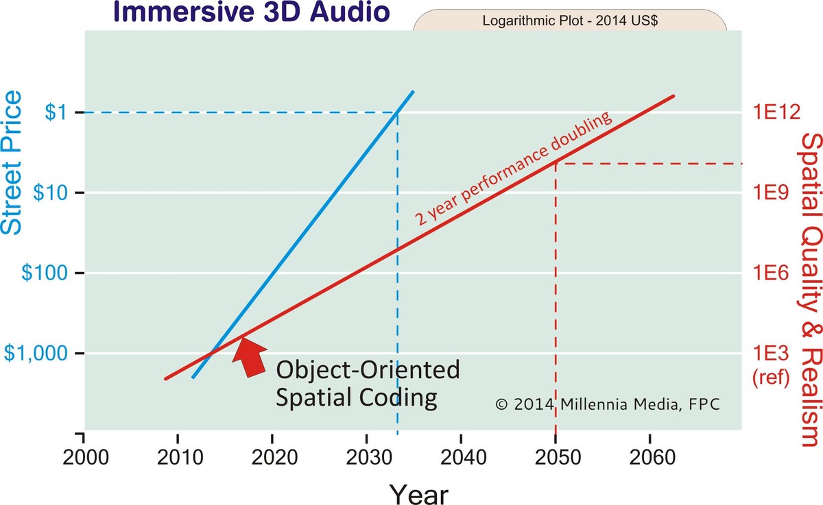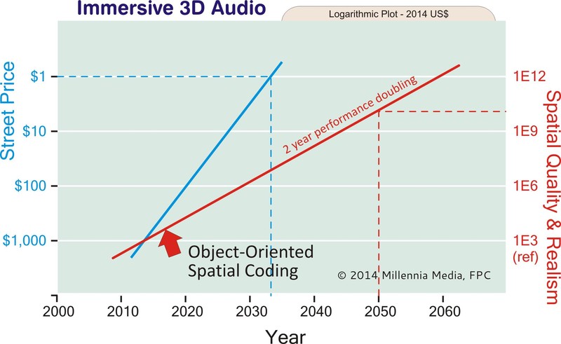 Over the next 20 to 30 years, 3D sound-field production and design will be one of the biggest growth areas in pro audio. Microphone designers, headphone makers, audio software engineers, and specialized post-production engineers will move from today's X-dot-X (5.1, etc.) paradigm to a seamlessly spherical, object-oriented sound field. If we plot a 3D audio growth chart with a two-year doubling projection, today's $1,000 3D audio solution will enjoy commodity pricing after 2025 combined with 100 times improvement in "spatial and timbral resolution experience" over headphones.