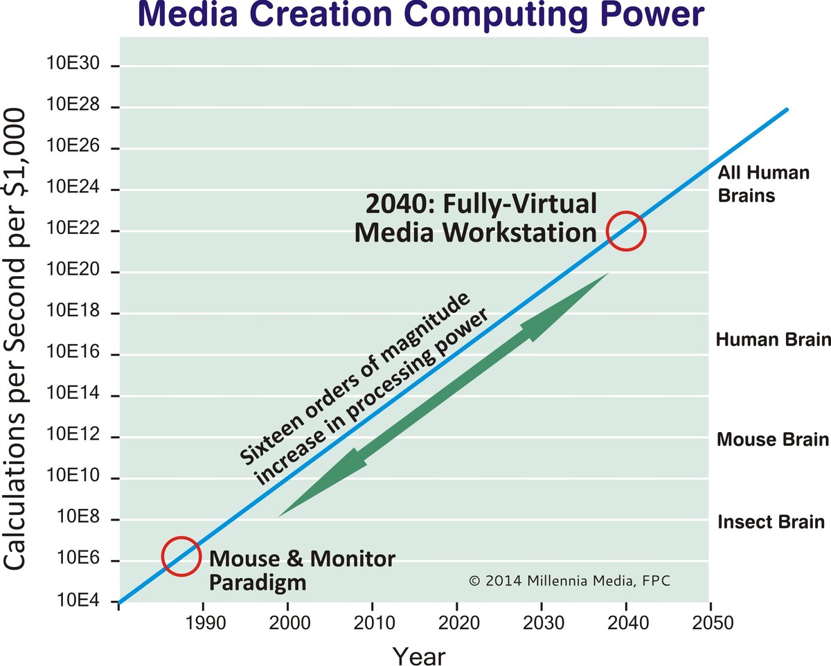 Today, a $400 Sony PS4 employs around 5 billion transistors, with 2 teraflop graphics processing — about the same computing power as one mouse brain (according to inventor and futurist Ray Kurzweil). By 2027 a commodity gaming console will be 10,000 times more powerful than today's machines. That's the processing power of a human brain sitting on your desktop — roughly equivalent to the power of IBM's Watson supercomputer in 2010. With effectively unlimited processing power, and profoundly advanced AI, our future production tools will allow us to call up a visually and musically correct symphony orchestra in any concert hall of our choosing. Let's add a Bulgarian choir, or maybe Yo Yo Ma on his carbon fiber cello. Immersive media creation systems will allow us to organically develop our own musical ideas by intelligently interacting with each desk of a symphony orchestra, or a gamelan orchestra, or a rock band — or whatever — of any size, and in any space (assuming our desired players, instruments, and acoustic spaces have been characterized). Gestural and voice commands will make refinements to the score and performance, just as a conductor or producer would rehearse real-space talent, until the ensemble plays exactly as we envision. Our technology growth charts suggest that by 2040, we will achieve all of this (and perhaps more) in a VMW — Virtual Media Workstation.