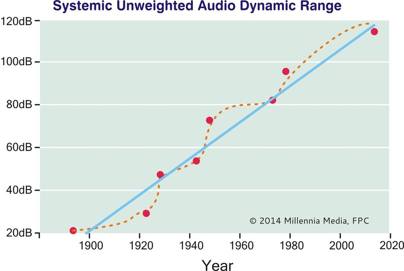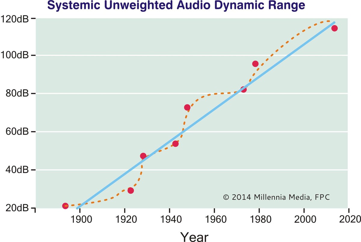 When we "average" (or "smooth") 120 years of dynamic range, we see that its growth slope is predictable. From the beginning of audio recording, commercial dynamic range has improved by roughly 0.8 dB per year — the equivalent of around one-bit every seven years. Thus, we can confidently extend our growth slope into the future, and expect the trend to continue... until real-world dynamic range is no longer limited by technical or economic factors in audio systems.