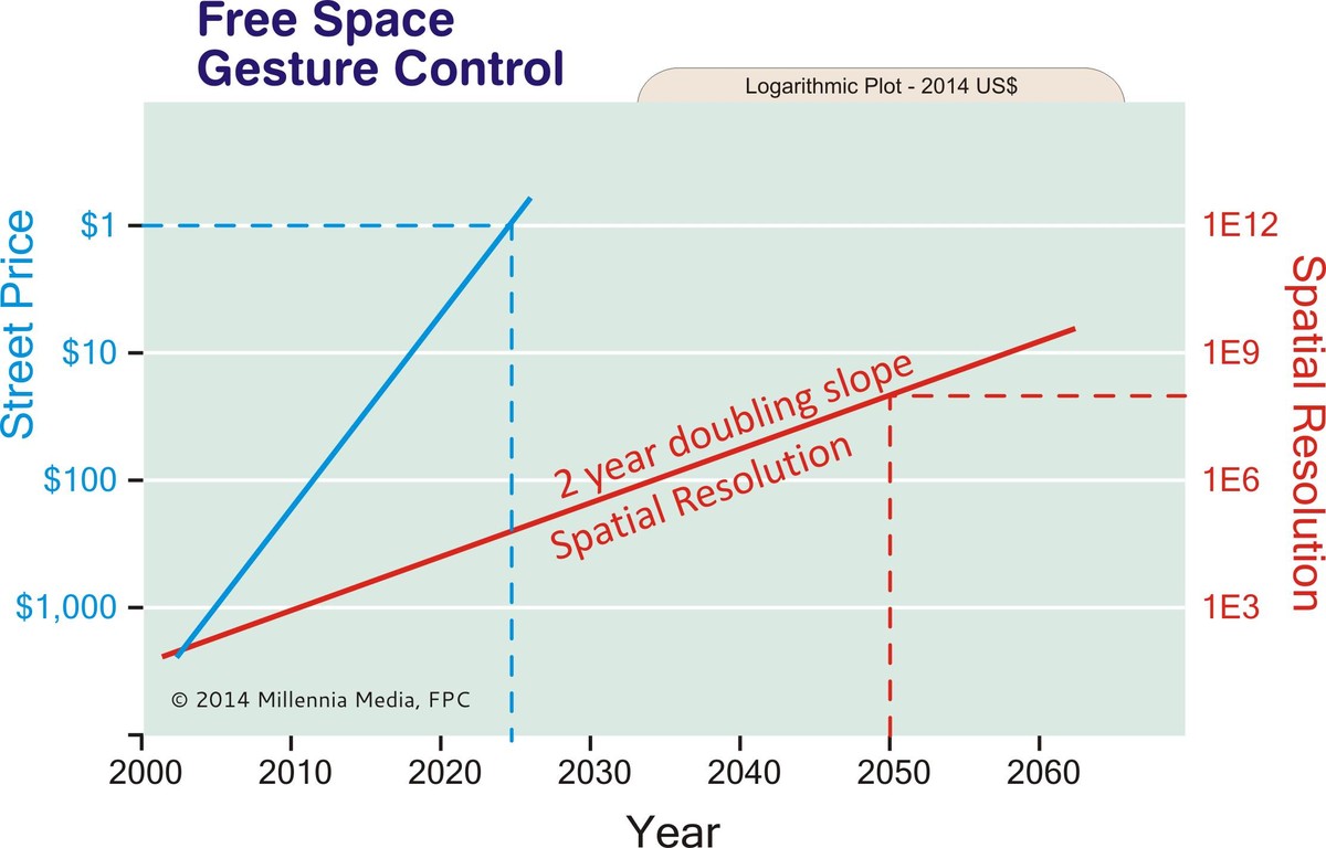 We conservatively assume that gesture technology resolution and accuracy will double every two years. Common gestural devices ($100 at 150 PPI by today's standards) will boast two orders of magnitude greater resolution by roughly 2025. Costing only a dollar, with 15,000 3D positions per inch, such devices will allow for much larger stages of freedom and movement. By approximately 2030 to 2035, sophisticated, high-resolution, free-air gestural control will be a mass-produced commodity. Will gesture replace touch screens and mice by 2035? No. But the transition will be well underway. The next 35 years of human-computer interaction are clearly free-space and gestural.