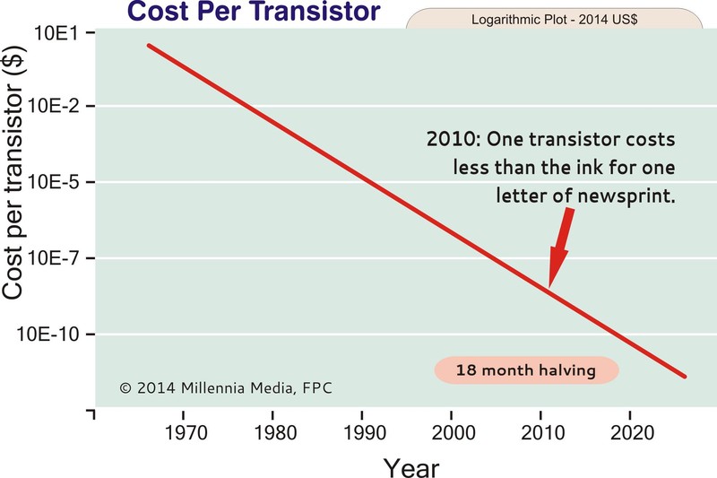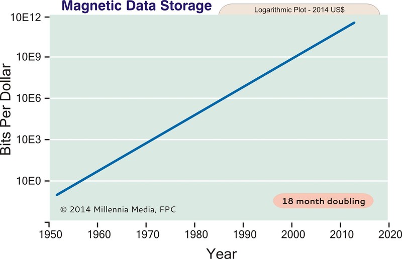 For example: since 1990, the cost-performance efficiency (CPE) of wireless devices has doubled every seven months. From 1980, the CPE of video display technology has doubled every 18 months. And since the early 1950s, magnetic storage bits-per-dollar has doubled every 18 months.