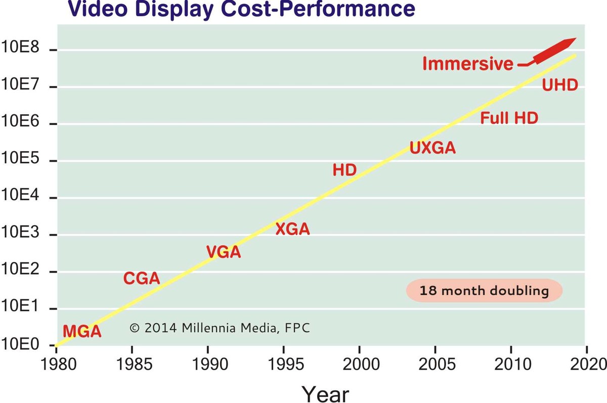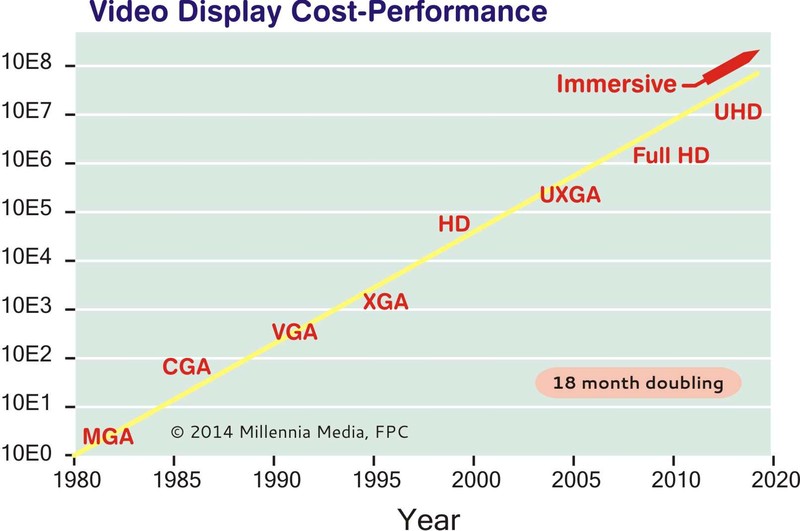 Let's return to our trend analysis: comprehensive video display cost-performance efficiency (CPE) since 1980 shows a doubling roughly every 18 months. Thus, by 2025 the CPE of immersive displays will be at least 100 times better — at a commodity entry point.