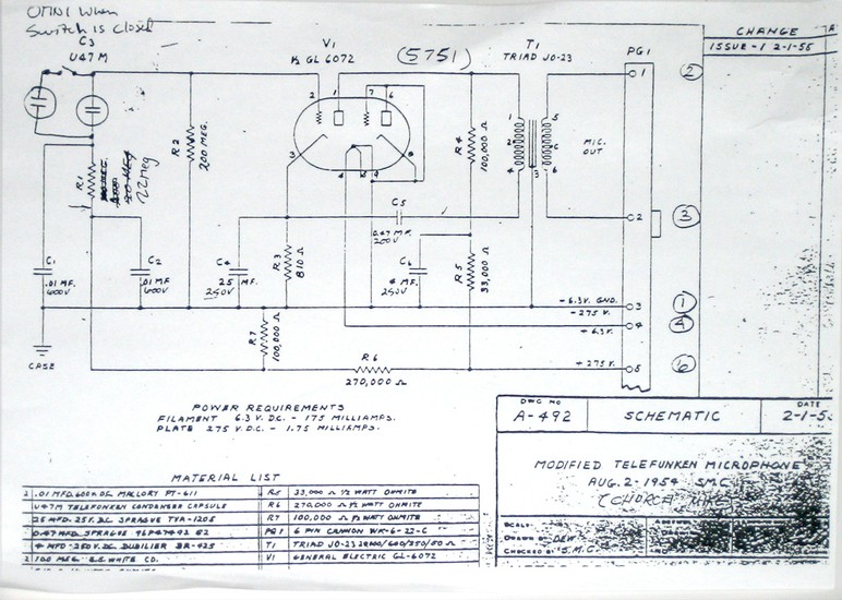 Church ordered a bunch (less than 100 but more than 12, based on the number of known Church mics) of U 47 capsules from Neumann and set out to build his own mic body and electronics, utilizing a 6072 vacuum tube with a high-voltage circuit (though there are at least three circuit variations known). He focused on using off the shelf, U.S.- available parts for the electronics, in keeping with the Hollywood tradition of using non-exotic gear that was easily and quickly replaceable if it failed during a production day (when potentially millions of dollars of talent were on set).