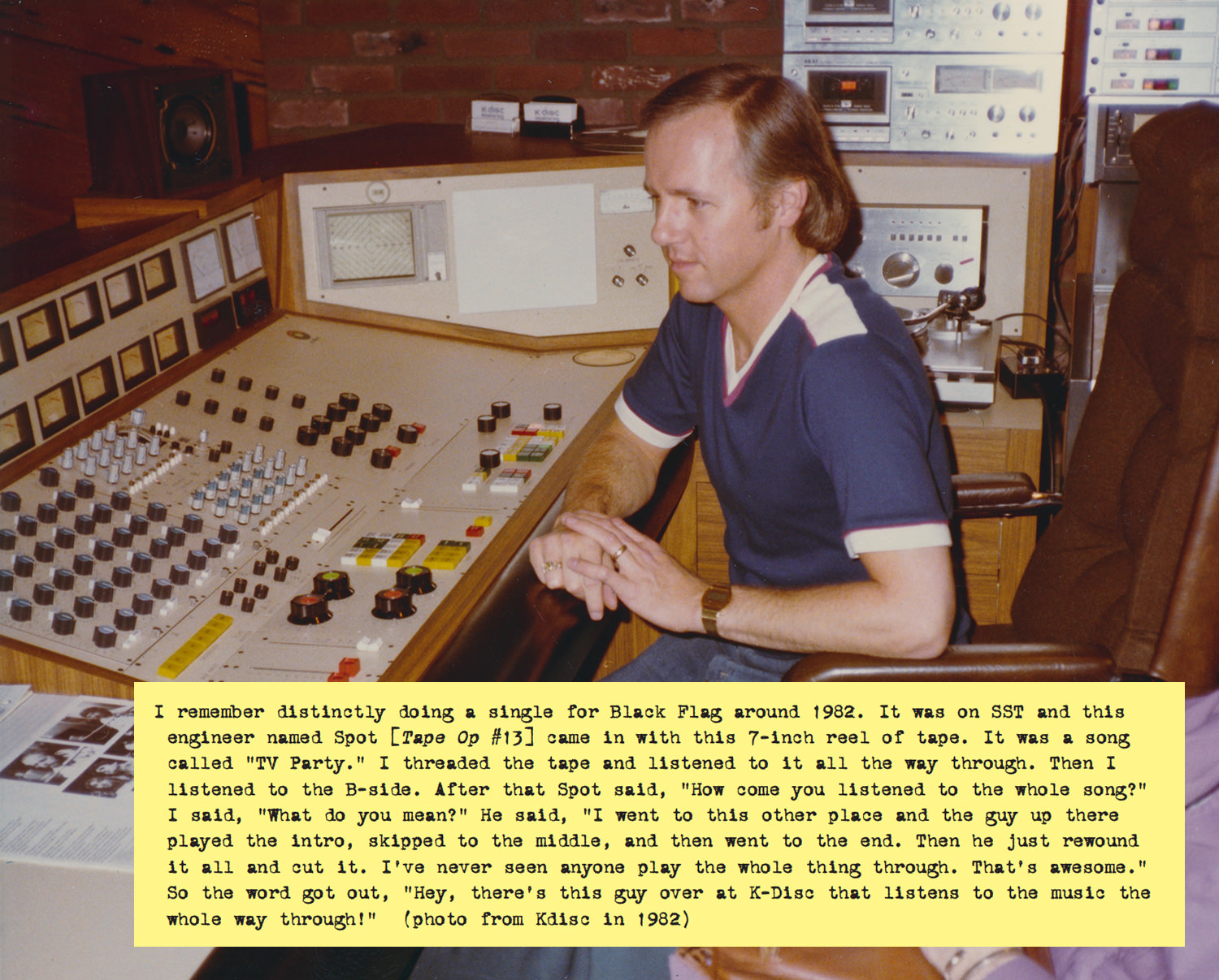 And that’s where the transition from major to indies began to take place. I remember distinctly doing a single for Black Flag around 1982. It was on SST and this engineer named Spot [Tape Op #13] came in with this 7-inch reel of tape. It was a song called “TV Party.” I threaded the tape and listened to it all the way through. Then I listened to the B-side. After that Spot said, “How come you listened to the whole song?” I said, “What do you mean?” He said, “I went to this other place and the guy up there played the intro, skipped to the middle, and then went to the end. Then he just rewound it all and cut it. I’ve never seen anyone play the whole thing through. That’s awesome.” So the word got out, “Hey, there’s this guy over at K-Disc that listens to the music the whole way through!” [laughter]