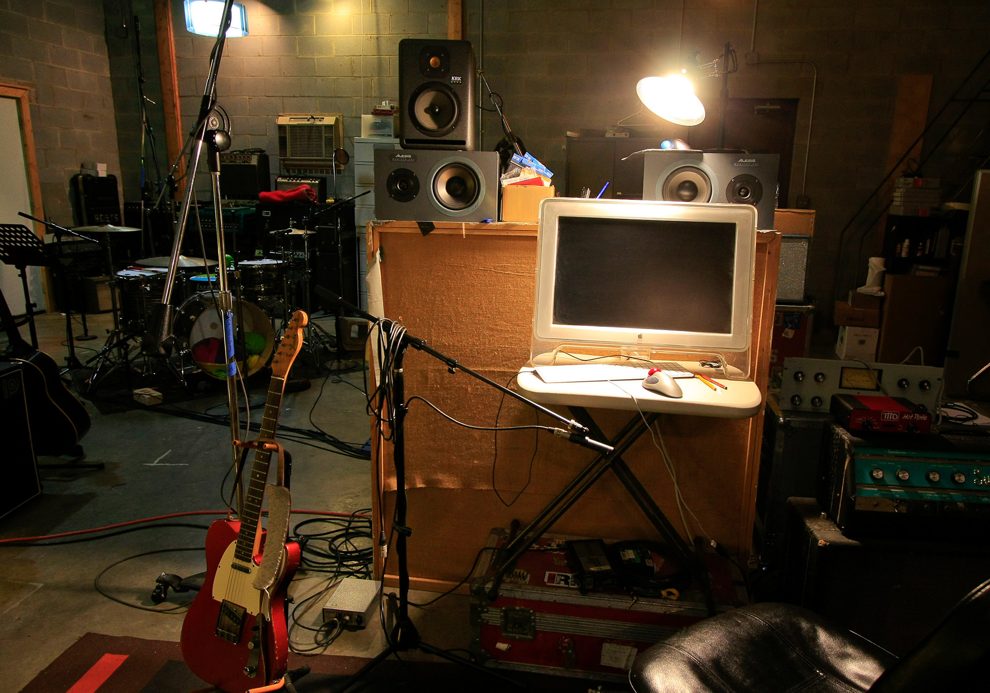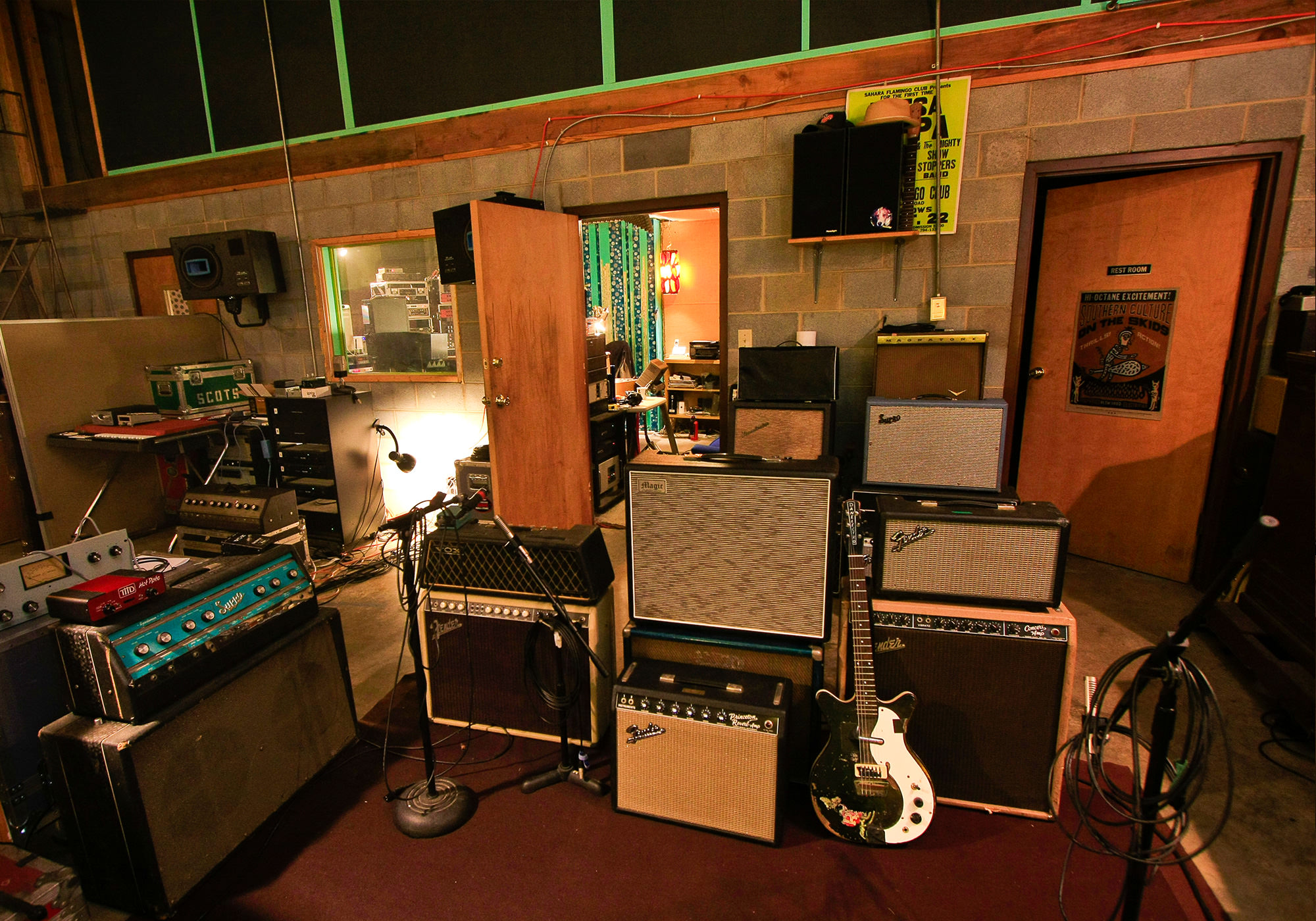 Well, we’ve always had a studio, going back to the beginning of the band in 1984. It grew. The Kudzu Ranch started out as a rehearsal place with a little Tascam Porta One; every place we’d move, it would move with us. I found this current place [a house with a detached building] in 1999. I bought it for the outbuilding; I put one wall in, closed up one of the bays, and turned it into a studio. I love the absorbent and reflective quality of raw cinderblock and concrete floors. [laughing] It really evolved out of a practice space, and has had more of a clubhouse flair than a [traditional] studio [vibe]. When we got signed to Geffen Records in 1994, I was living at an old abandoned gas station. I eventually moved from there to here, because I was looking for a bigger studio. This place has an old garage bay; it had been a car repair place and a guy built muscle cars here. There is actually a hydraulic lift in the other room!