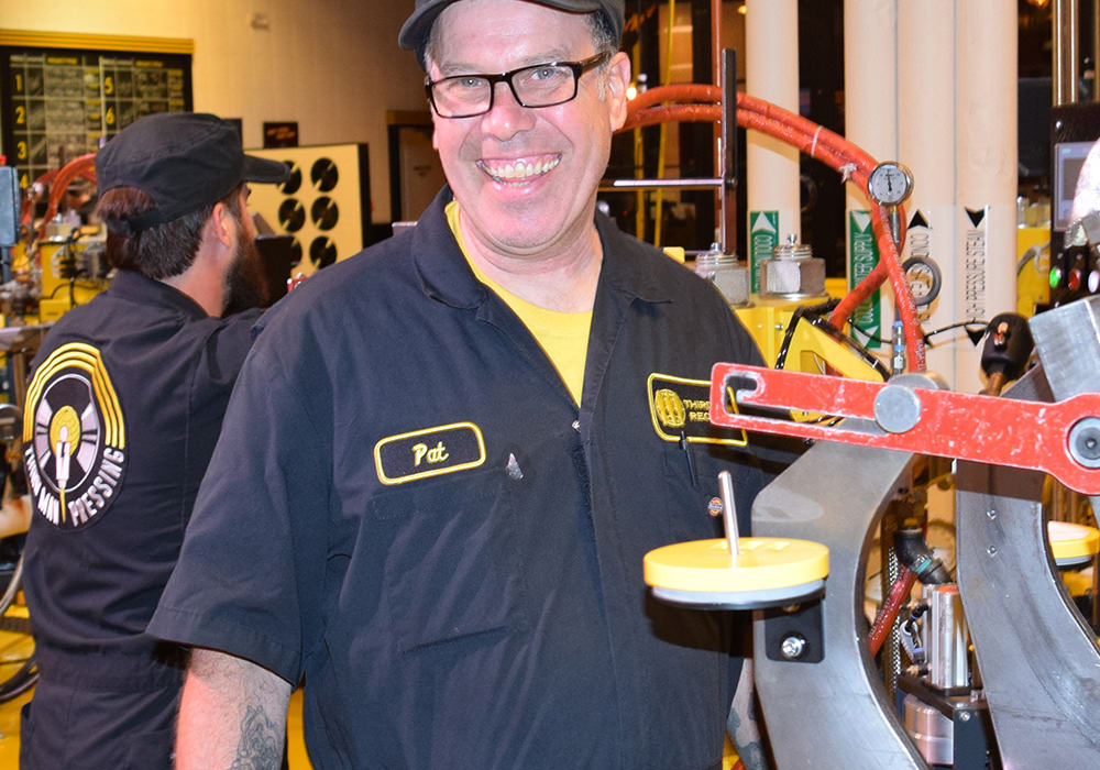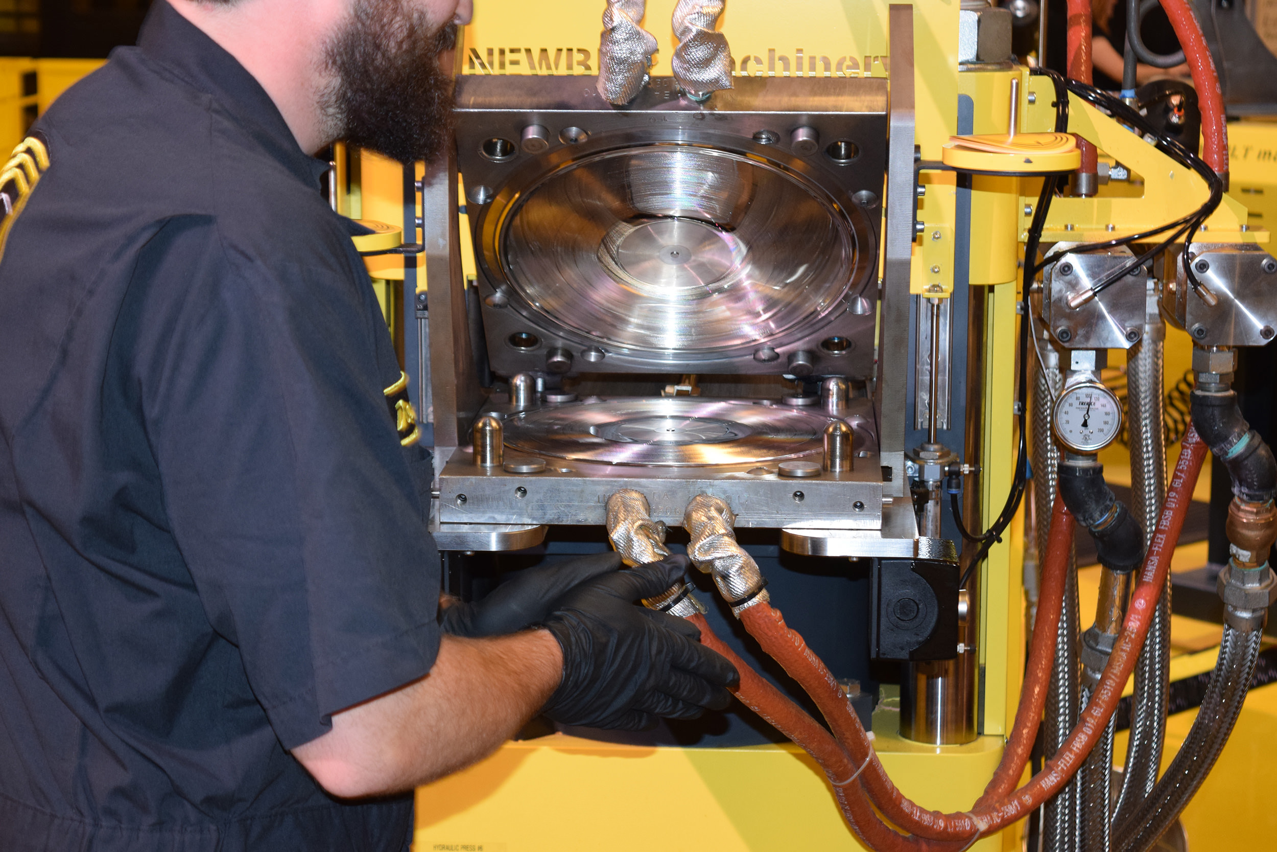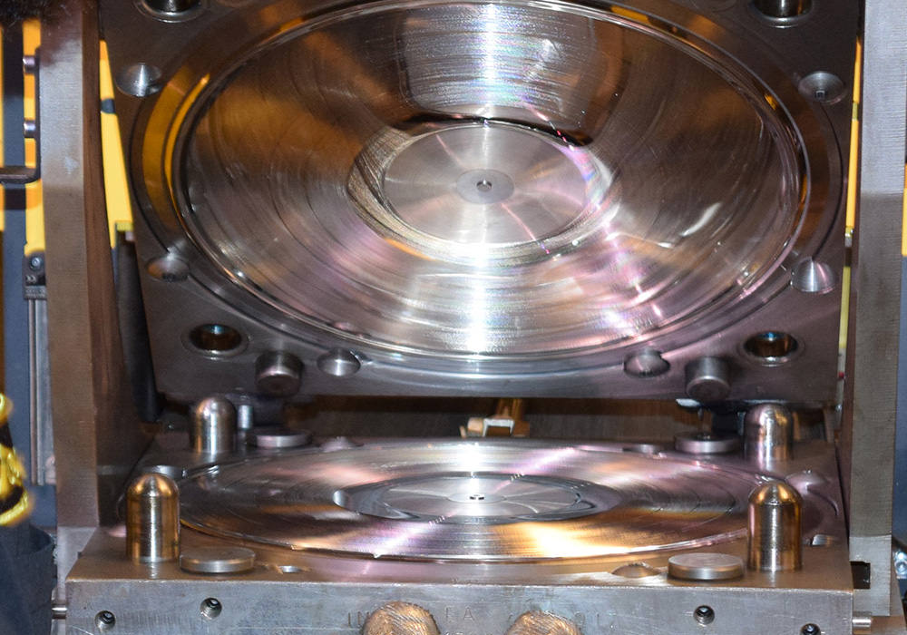 DB: Yeah; they're warmed up, and then a puck is formed, depending on what we're doing and what size. That gets put in the stamper, the presses. You press a button, the book mold closes, and it applies 3,000 pounds of pressure. Then steam heats them up, warms them up more, and then the vinyl spreads out and fills in the grooves.