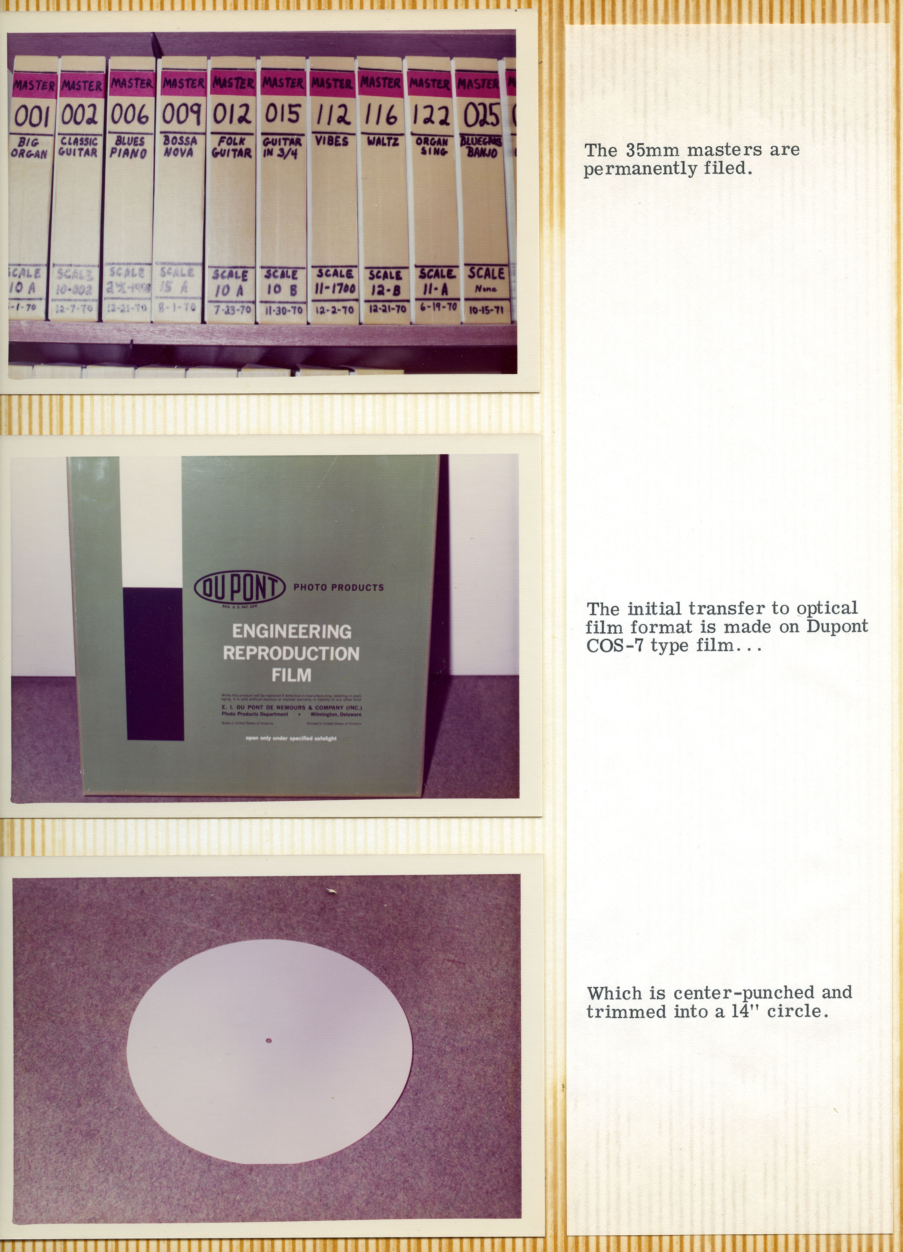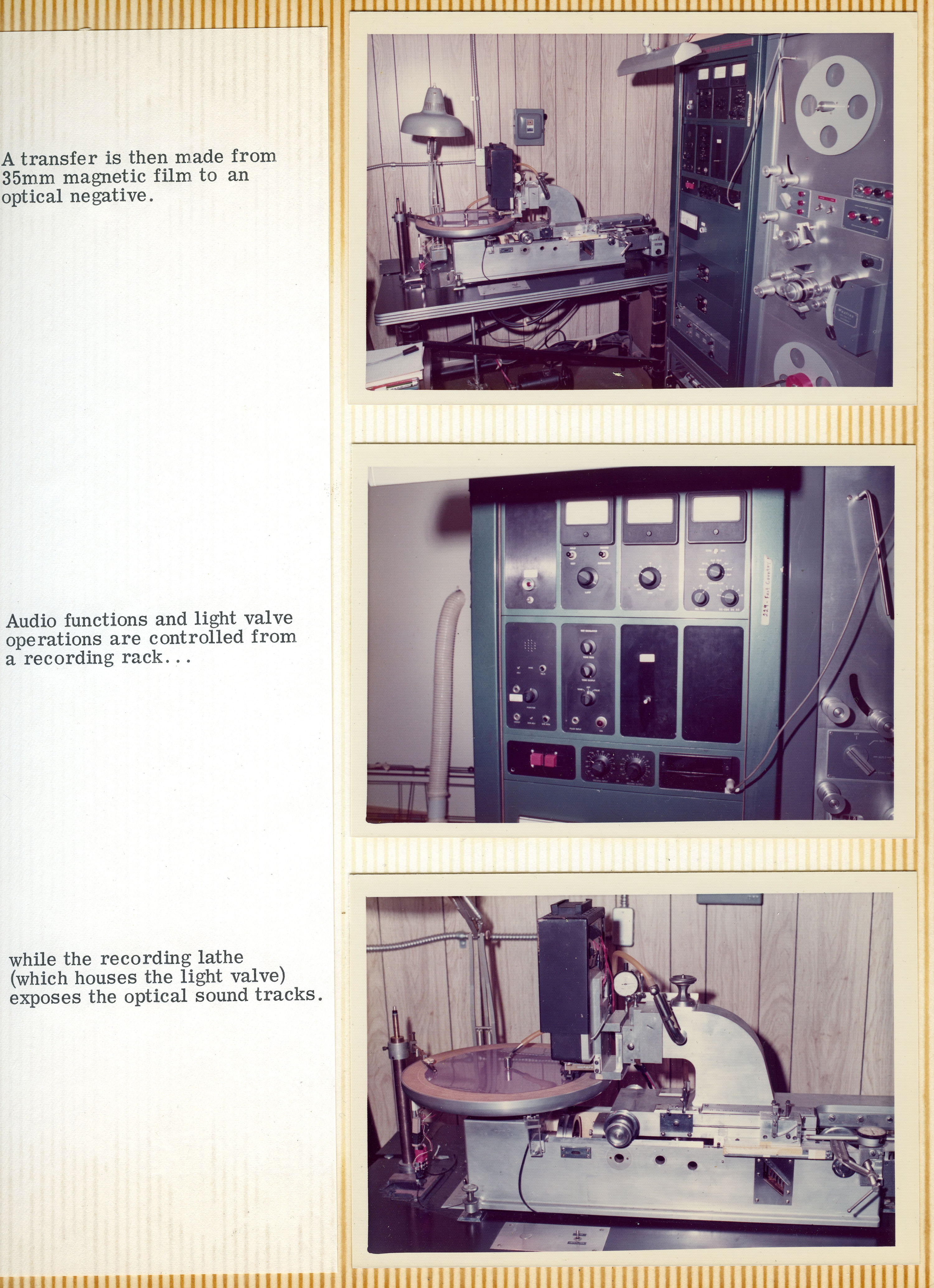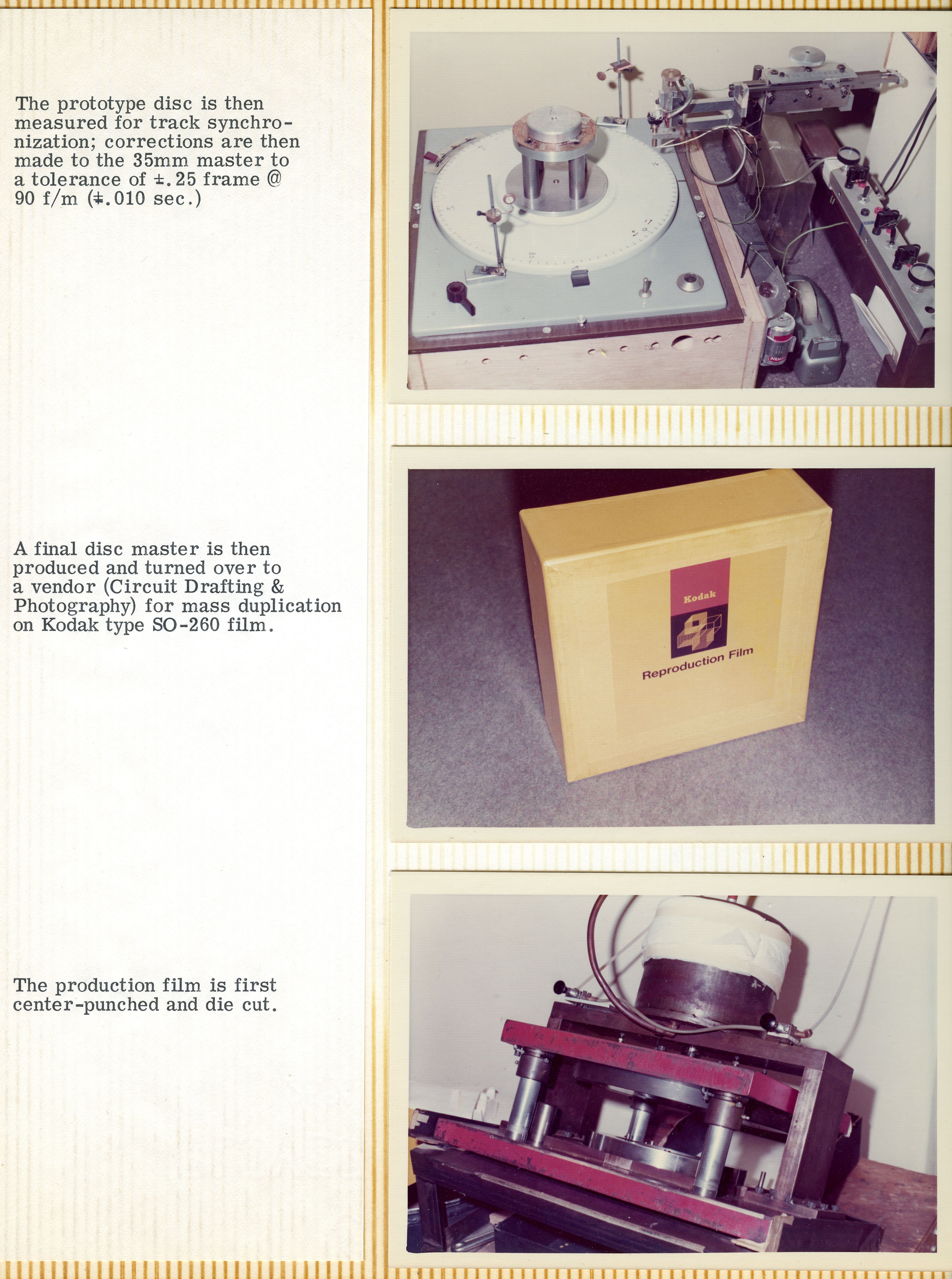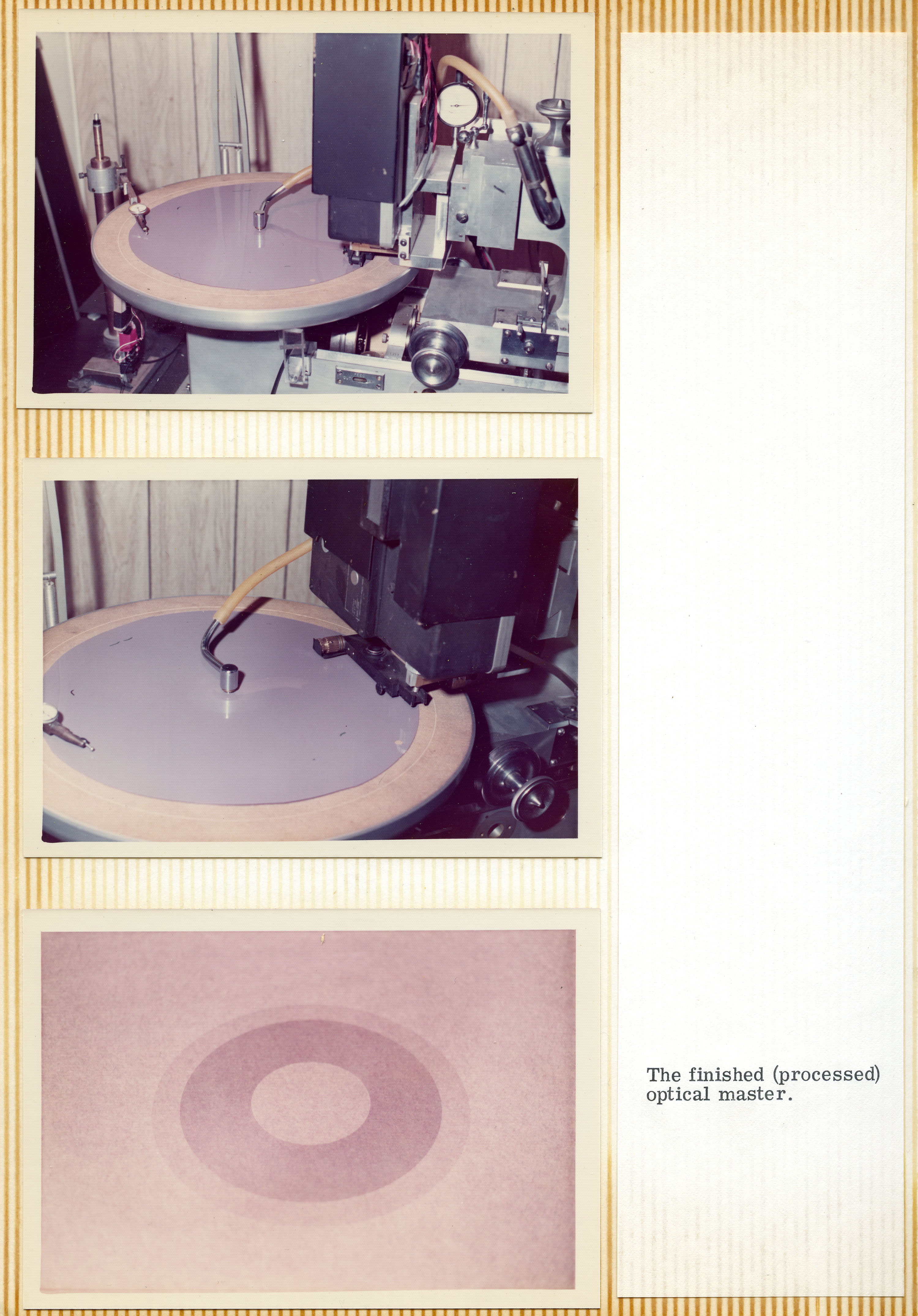 Yeah. They sold the entire operation to a company on the East Coast called Miner Industries. They were making Magnus and Estey chord organs and toys. They shipped everything off to the East Coast, but Mike was the guy that was in charge of making the discs. He was happy living in Southern California and didn't want to move to New Kensington, Pennsylvania. He had to convince them that they needed to keep him employed, because he was the only guy who knew how to do this complicated process, and there was no way he'd be able to teach anybody else how to do it. The whole reason for that photo essay's existence was to show those guys how complicated it was, and how much equipment was involved. He was playing it up. You can see from the photo essay that it starts with making studio recordings of musicians playing. From there, the tapes get mixed down and edited, and then transferred to magnetic film stock. Loops are created, and then they had this modified Scully lathe – instead of a cutting head. It had a light head on it.