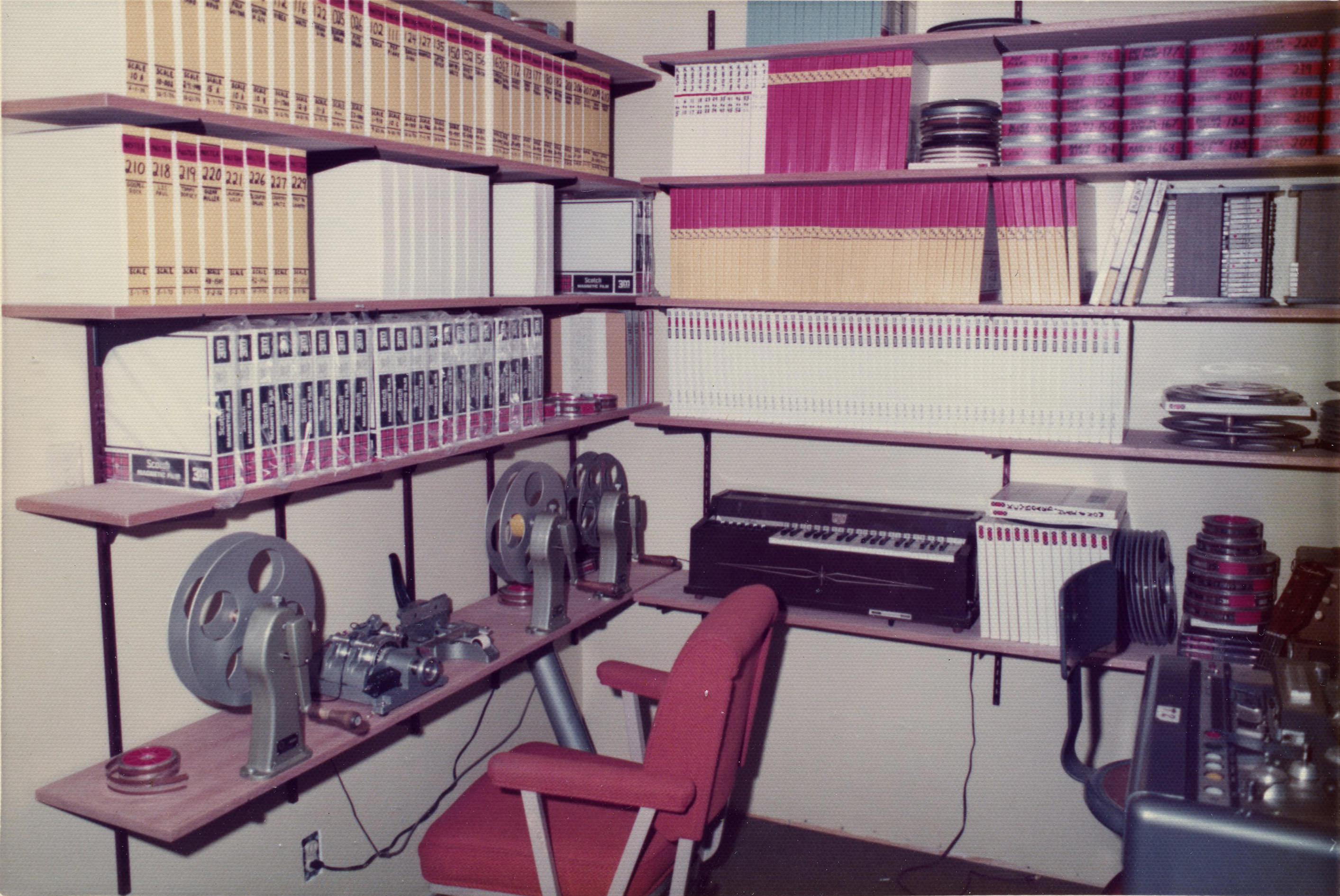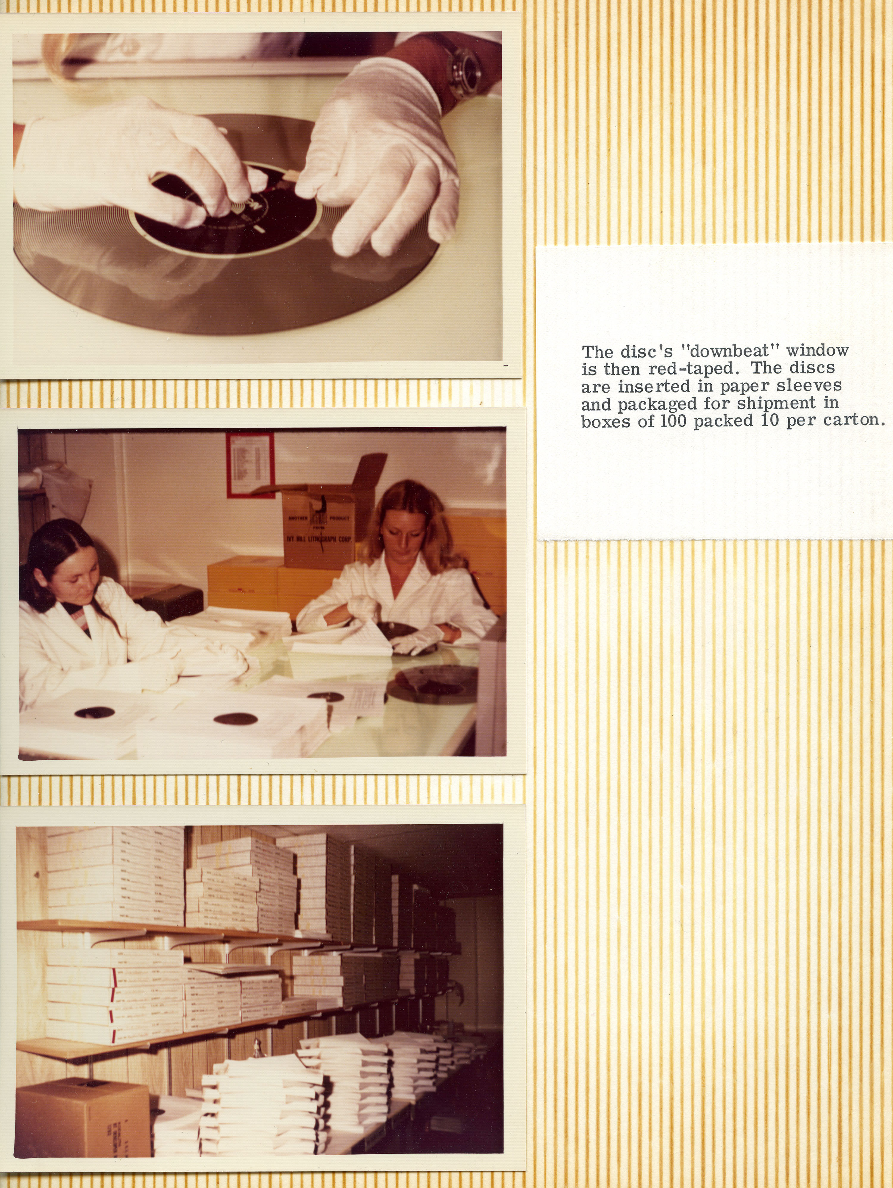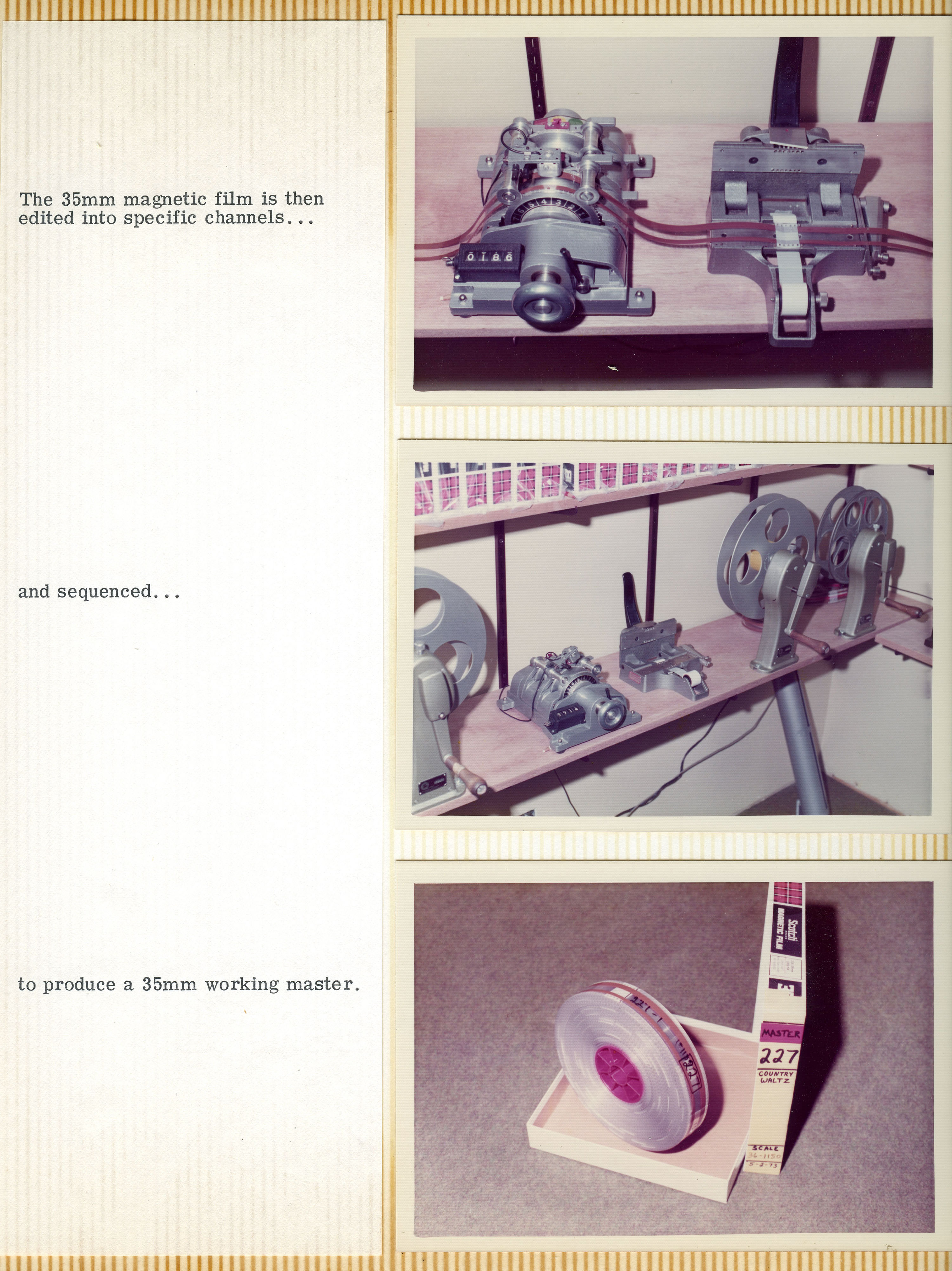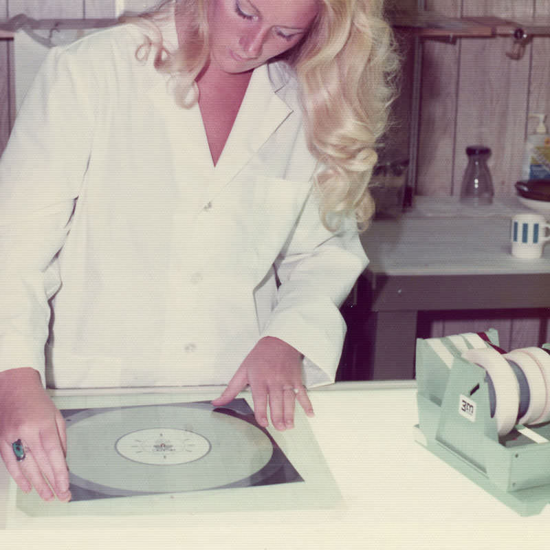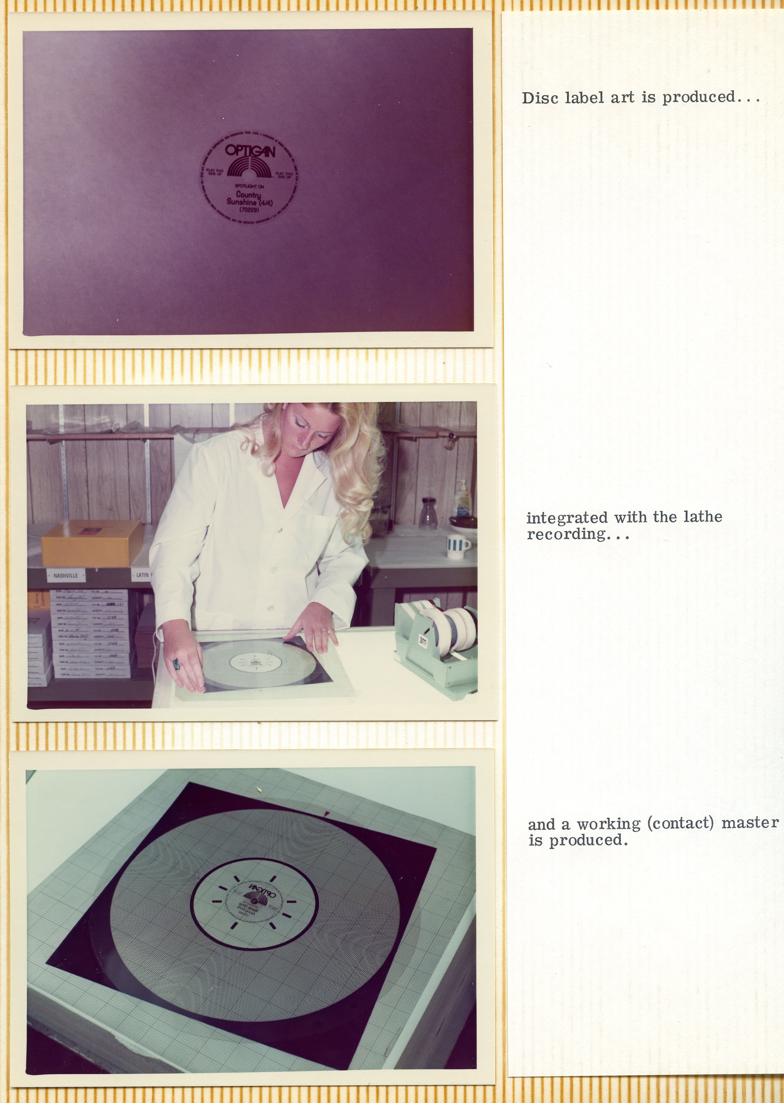Yeah. They sold the entire operation to a company on the East Coast called Miner Industries. They were making Magnus and Estey chord organs and toys. They shipped everything off to the East Coast, but Mike was the guy that was in charge of making the discs. He was happy living in Southern California and didn't want to move to New Kensington, Pennsylvania. He had to convince them that they needed to keep him employed, because he was the only guy who knew how to do this complicated process, and there was no way he'd be able to teach anybody else how to do it. The whole reason for that photo essay's existence was to show those guys how complicated it was, and how much equipment was involved. He was playing it up. You can see from the photo essay that it starts with making studio recordings of musicians playing. From there, the tapes get mixed down and edited, and then transferred to magnetic film stock. Loops are created, and then they had this modified Scully lathe – instead of a cutting head. It had a light head on it.