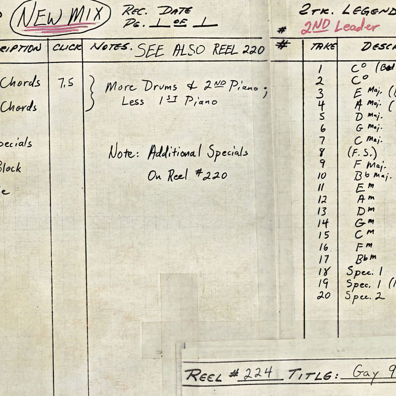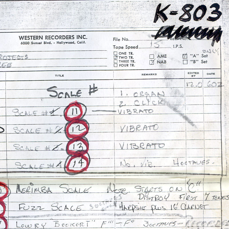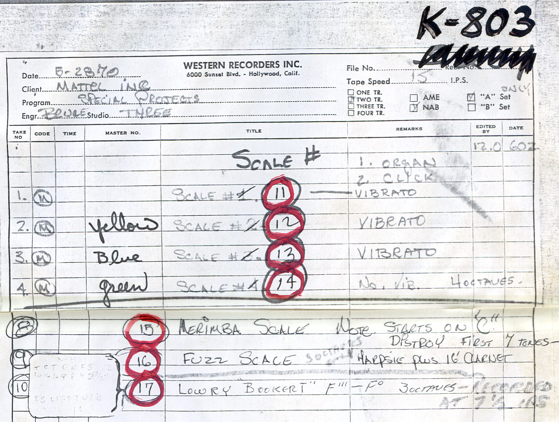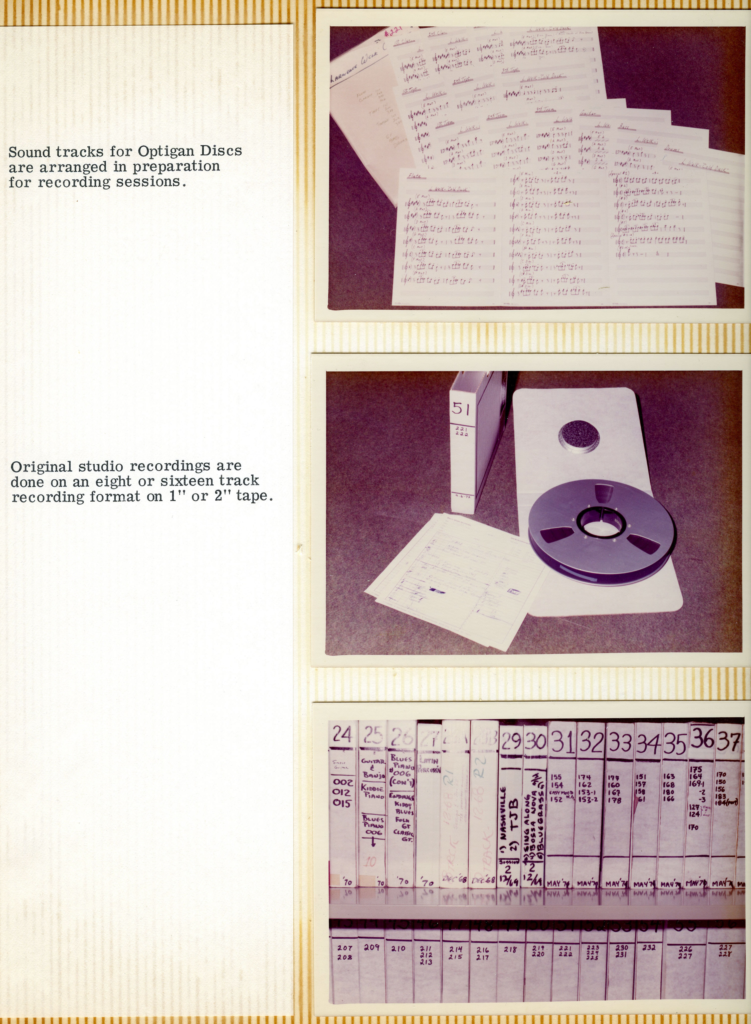 instrument. The earlier sessions have a much more comprehensive set of chords because they were experimenting. The recordings basically sound like a band jamming aimlessly around the circle of fifths. They would play four bars of C-major, four bars of G-major, four bars of G-minor. They knew that the basic structure was that they'd have these chord buttons, and then they'd have these special effects buttons with drum loops. A lot of people don't realize, but on an Optigan all the sounds on the keyboard are also on the disc. It's not like the keyboard is an electronic organ and the chord buttons are sound recordings. Every sound that the thing makes lives on the disc and is a recording. On an Optigan disc, there are 57 loops of sound: 37 for the keyboard, and 20 for the chord buttons and drum loop switches. For the keyboard tones, whatever organ was available, they recorded. They made all these recordings for some raw material to experiment with and figure out how to make these discs. It took them a year or so to figure out how to make the discs. After they got rolling and the hardware came along, then they started to get more focused on recording material for the discs. Mattel were notoriously cheap, and they decided that L.A. session musicians were too expensive. They flew to Germany, because German session guys were a lot cheaper than L.A. session guys. They went to a studio in Cologne. On the tapes, you listen to between takes to people bantering and there're these guys in the studio speaking German. Then somebody gets on the slate and says, "Okay, Nashville country, take one" and then they bust into a bunch of German guys doing their version of country music. A big part of the charm of those discs is that it's German guys trying to play Motown music. That's why it's a little bit off and cheesy. The first half of the discs that they released for the Optigan came from those German sessions. It wasn't until they launched the product that they started to take the recording aspect of it a bit more seriously, and spend a little more money. They had a second phase of recordings that they did in L.A. There are three or four big band discs where they hired Art Depew – the trumpet player for Lawrence Welk – to write arrangements. It was all guys from the Lawrence Welk band. They were taking it more seriously, actually writing arrangements as opposed to on-the-fly improvising in the studio. That's some of the more advanced material on the master tapes. The tapes that Mike saved are the mixdown masters. The Optigan is mono, but they're two-track stereo tapes. In one channel is the music, and the other channel is the click track.