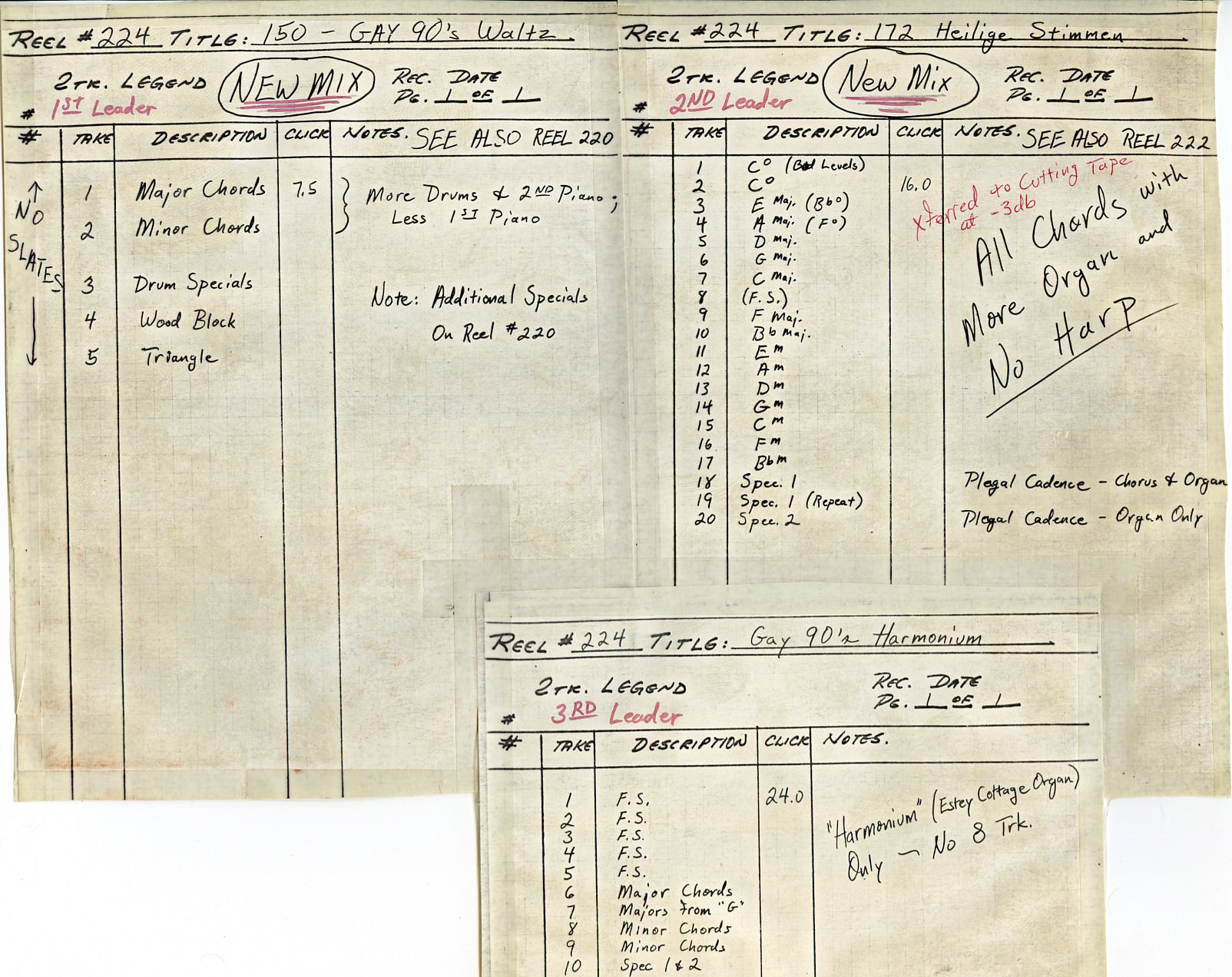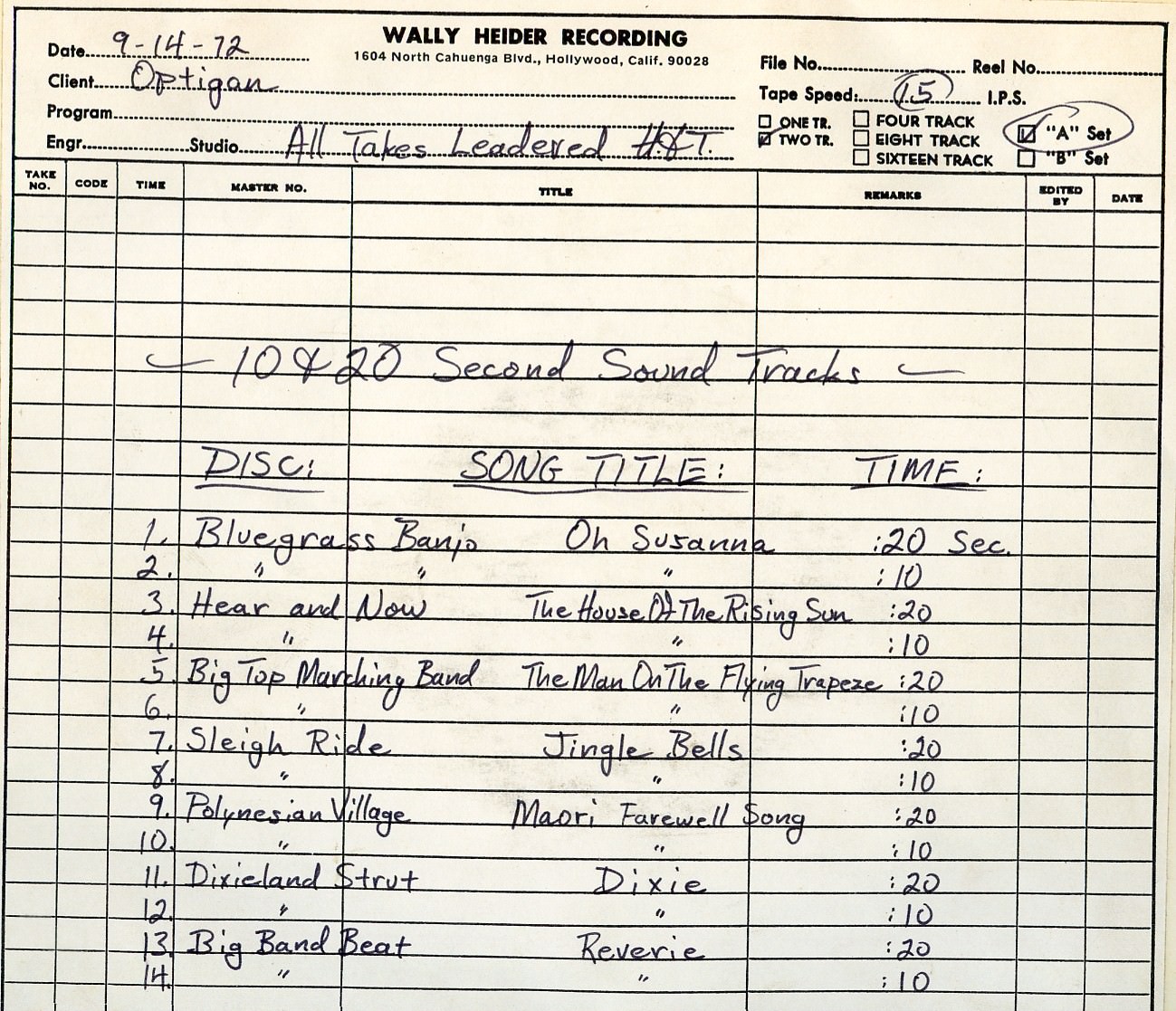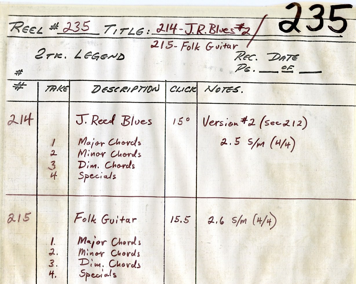 instrument. The earlier sessions have a much more comprehensive set of chords because they were experimenting. The recordings basically sound like a band jamming aimlessly around the circle of fifths. They would play four bars of C-major, four bars of G-major, four bars of G-minor. They knew that the basic structure was that they'd have these chord buttons, and then they'd have these special effects buttons with drum loops. A lot of people don't realize, but on an Optigan all the sounds on the keyboard are also on the disc. It's not like the keyboard is an electronic organ and the chord buttons are sound recordings. Every sound that the thing makes lives on the disc and is a recording. On an Optigan disc, there are 57 loops of sound: 37 for the keyboard, and 20 for the chord buttons and drum loop switches. For the keyboard tones, whatever organ was available, they recorded. They made all these recordings for some raw material to experiment with and figure out how to make these discs. It took them a year or so to figure out how to make the discs. After they got rolling and the hardware came along, then they started to get more focused on recording material for the discs. Mattel were notoriously cheap, and they decided that L.A. session musicians were too expensive. They flew to Germany, because German session guys were a lot cheaper than L.A. session guys. They went to a studio in Cologne. On the tapes, you listen to between takes to people bantering and there're these guys in the studio speaking German. Then somebody gets on the slate and says, "Okay, Nashville country, take one" and then they bust into a bunch of German guys doing their version of country music. A big part of the charm of those discs is that it's German guys trying to play Motown music. That's why it's a little bit off and cheesy. The first half of the discs that they released for the Optigan came from those German sessions. It wasn't until they launched the product that they started to take the recording aspect of it a bit more seriously, and spend a little more money. They had a second phase of recordings that they did in L.A. There are three or four big band discs where they hired Art Depew – the trumpet player for Lawrence Welk – to write arrangements. It was all guys from the Lawrence Welk band. They were taking it more seriously, actually writing arrangements as opposed to on-the-fly improvising in the studio. That's some of the more advanced material on the master tapes. The tapes that Mike saved are the mixdown masters. The Optigan is mono, but they're two-track stereo tapes. In one channel is the music, and the other channel is the click track.