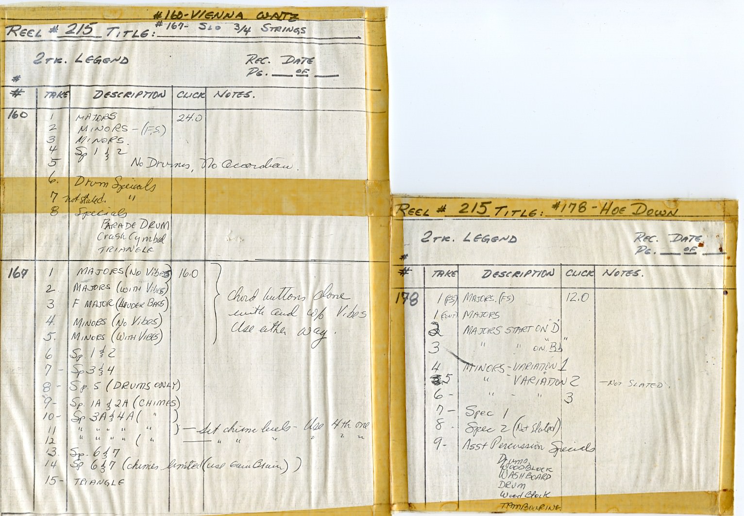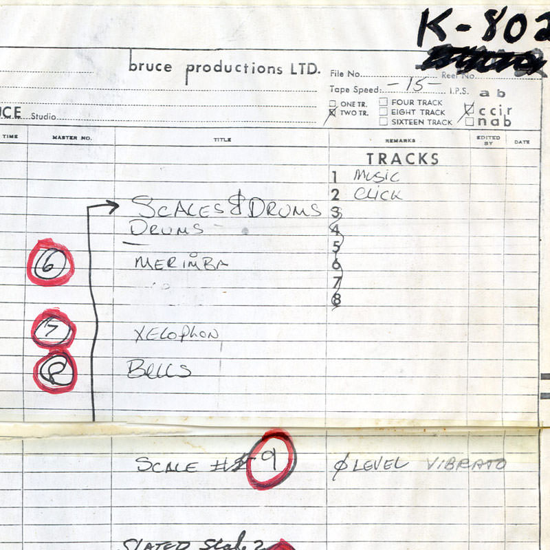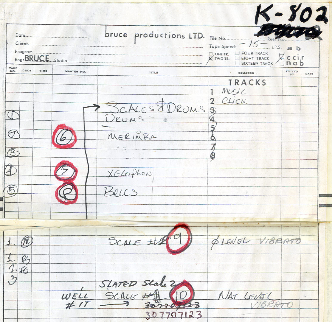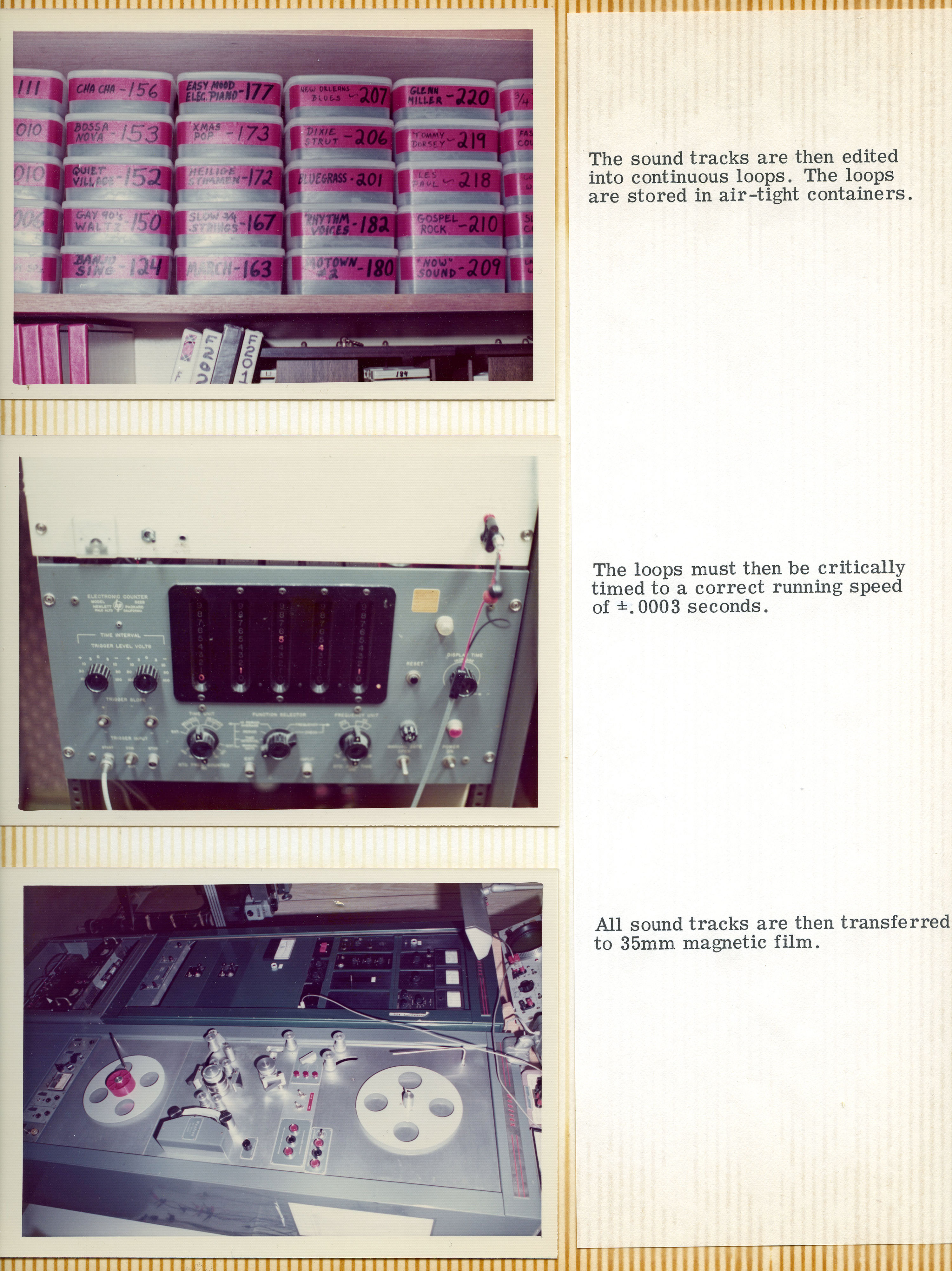 I think click tracks were not a totally new thing, but they were somewhat new, as far as the musicians were concerned. If there's a drummer, most of the time they're trying to follow the click, but they're doing their own thing. It was an important reference because dealing with analog tape, Mike had to find music loops that were as close to sync with that click track as possible. He had to listen carefully and say, "Okay, they played this chord eight times. This one is the closest to being in sync with the click track, so I'm going to edit that one out." Then it gets transferred to magnetic stock tape. It's a painstaking thing.