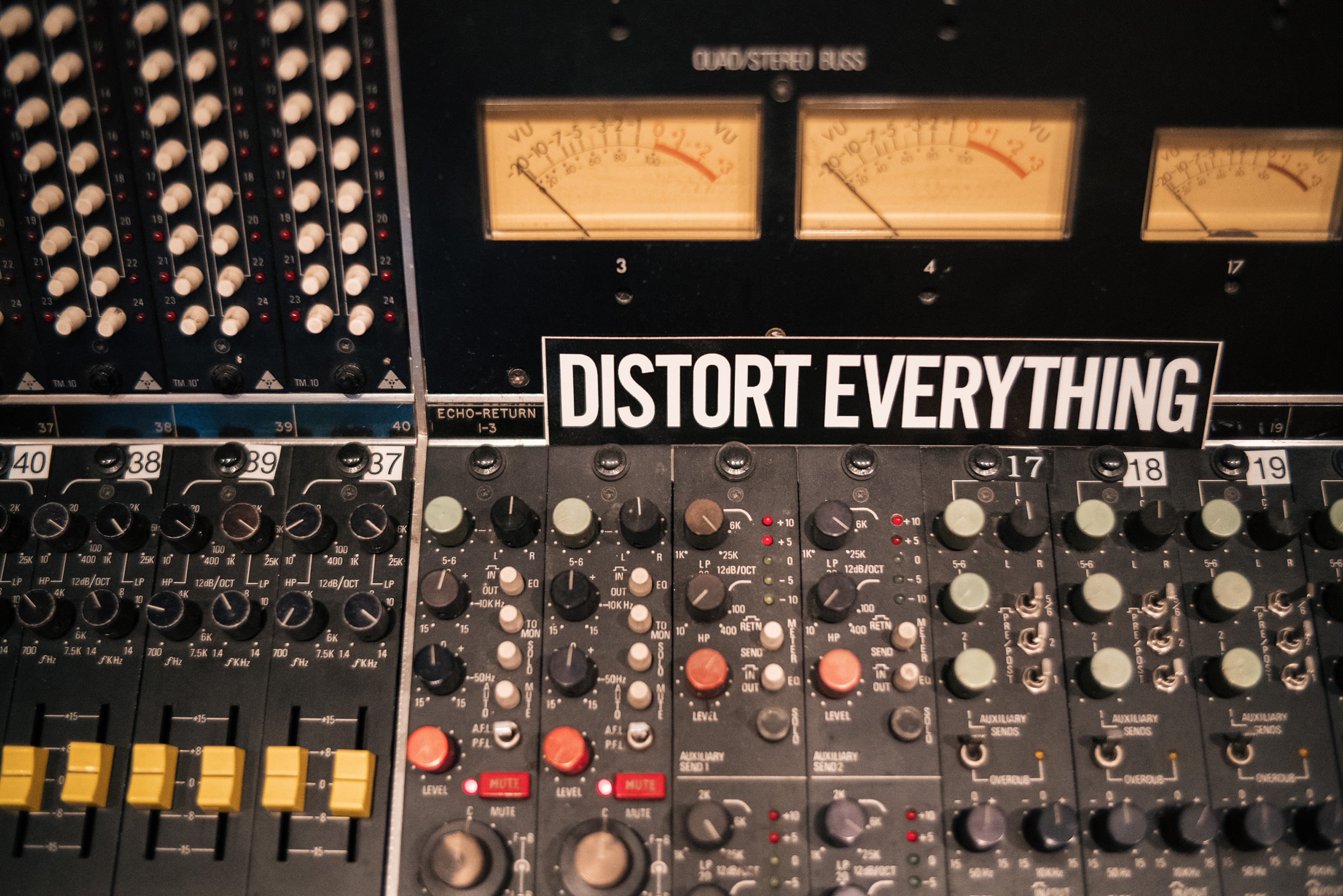 I knew you were going to ask this. [laughs] I think the answer is yes. There’s a mono crush bus on the drums. Kick, snare, toms, going through one of those [Louder Than Liftoff] Colour modules and distorting quite a bit. There’s a parallel drum bus that’s a pair of [Universal Audio] 1176s with two buttons in. It's not quite distortion, but it’s pretty gritty. There’s PSP VintageWarmer 2 [plug-in] on the kick. There’s an SPL TwinTube plug-in on the guitar bus. The vocals are splattered through the Ampex 351 [tape recorder electronics] that I borrowed from you.