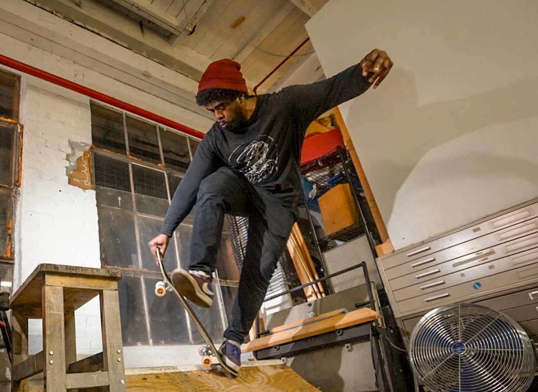 Downstairs. We have an art studio, ping pong table, and it’s a great drum room. I can fish a line from upstairs to mic it up. I have a workstation down here where I do all of my soldering, and there’s the skate ramp. [a small quarter pipe up against window]
