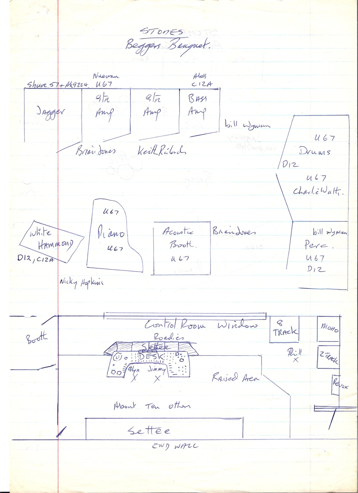 Charlie was set up in the permanent drum booth on the right hand side of the studio (seen from the control room), with three other booths built out of screens in the center of the room, to accommodate Mick, Keith and Bill. In the large area in front of the control room window we put the piano, the Hammond organ and a booth for Brian. This still left enough space for acoustic set-ups and overdubs. Our start time was any time after 2pm, as we had a 24-hour lock out. The set-up was Charlie — drums, Bill — bass, Brian — acoustic guitar, Keith — electric guitar, bass and percussion, and session musician Nicky Hopkins — piano and organ. Mick played various percussion instruments, the occasional acoustic guitar and sang guide vocals. Nicky was an absolute sweetheart, mellow and relaxed — a real gentleman. Jagger and Richards, along with producer Jimmy Miller, took control of the sessions for feel, approach and arrangements. Each song was first run through and rehearsed with Brian, Mick and Keith. Bill and Charlie were not usually involved until the structure of the verses and choruses had been agreed. We tried out every possibility when recording songs. "Street Fighting Man" was transferred to 8-track from a basic cassette demo of Keith's. Some songs, like "Sympathy for the Devil", went through many different styles and feels before the band settled on a final version. Because of the limited selection of studio effects then available, sounds had to be created at the source, so we tried different guitars, amps and microphones and various unusual locations in the studio building — recording overdubs for "Street Fighting Man" with Charlie playing an African tom-tom in the stairwell. When recording songs played on acoustic instruments, Glyn would use a mic set-up similar to the one he used with Traffic. The band would be in a circle on the floor...