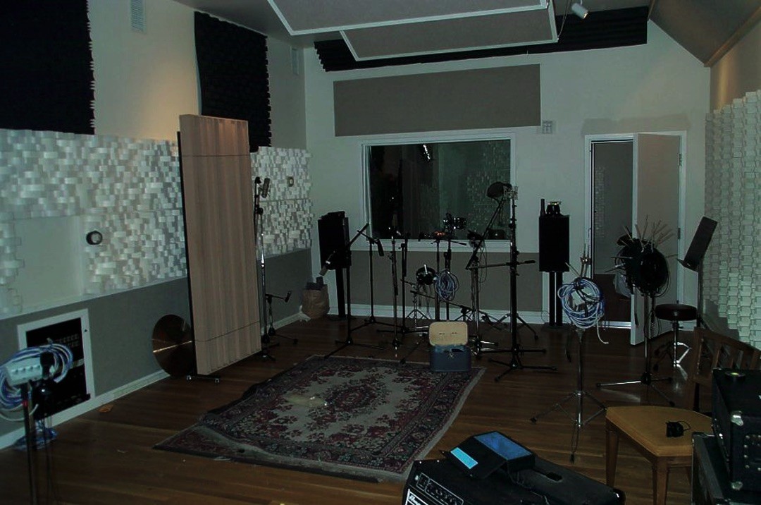I was going to build one big room in there and I talked to an acoustics guy and he gave me the absolute longest length given my width and height that I could work in for the least amount of standing waves. I went with his acoustics idea. I found out that if you're not building a really multi-sided room, to stay with a pretty strict rectangular shape. The reason being is, and I didn't know this, that if you create a very limited frequency standing wave, that it's a lot easier to handle and deal with then if you tilt a wall slightly and create a band of standing waves in a certain frequency area. So let's say you've got a standing wave that's sitting at 100 Hz and then you cock your long wall a couple of degrees then all of a sudden you have a multitude of standing waves from 90-110 Hz. So I did that and I talked to RPG and their idea was absorption on the walls and diffusion on the ceiling, which I wasn't into. It seemed like I would waste my time doing a large room and then kill the reflections on the walls because we don't hear things that way. I'm not killing them because I did the opposite thing-some hanging panels on the ceiling to break up the ceiling-to-floor reflections and diffusion on both of the long walls. You've heard it — it's a very live room. You can hear it on [Clutch's] "Jam Room" really.