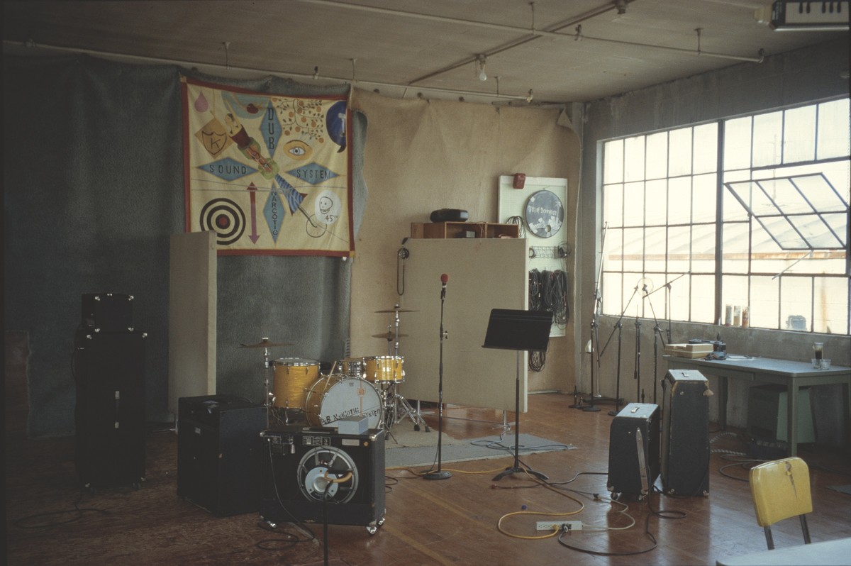 I think it's like 110 ft by 45, [the ceilings are] 11 1/2 feet. The thing about this room that's really cool, is that there're no columns or beams or anything at all. It's a completely open space, and there're windows on three sides, so the light's really amazing. All of us, every day, are just like, "Thank god we get to work here." I really like the idea that people are using it. It has multiple uses. There have seriously been times when people have been recording, mixing, silk-screening, painting. It's all happening at the same time, and that's just part of it. My idea for a studio is just getting an atmosphere where people will feel like they are going to be able to be creative. I think that the way I did that before, in the basement when we first started, and here, also, is to try to create a situation that is really different from what people may have experienced in a studio. But, also, make them feel like — maybe not consciously — "Hey I'm gonna do some really good work here." I think part of [where that feeling comes from] is that we don't have a clock anywhere in the studio, and part of [it] is that no one's paying anything for it [the studio]. Everyone who records here, pretty much it's for K. I think when you go into a real studio, it's so enclosed and encased, and there's this feeling like, "Okay, we got to get in here, and we gotta do it!" I think there's a little bit of an adrenaline rush that might be helpful, but I think, a lot of times, there's a stress level that gets people off edge. Some people can work really well in that air. Other people walk in and go [shifting head around quickly and nervously], "Oh wow this is the real thing!" You get somebody's cassette release and it's really cool, "Wow, I can't wait for the record to come out." Then, the record comes out, and it's all really flat and weird sounding. When they made the cassette, they just did it, and it's great. When they made the real record, it's all uptight and it just didn't have any...