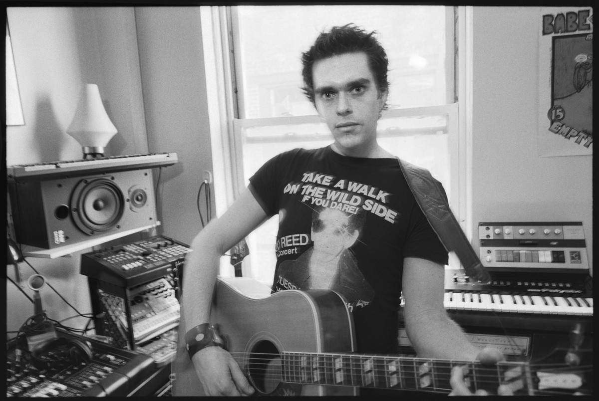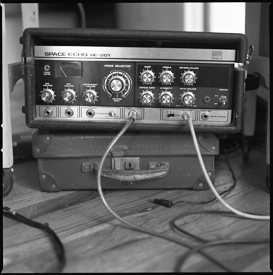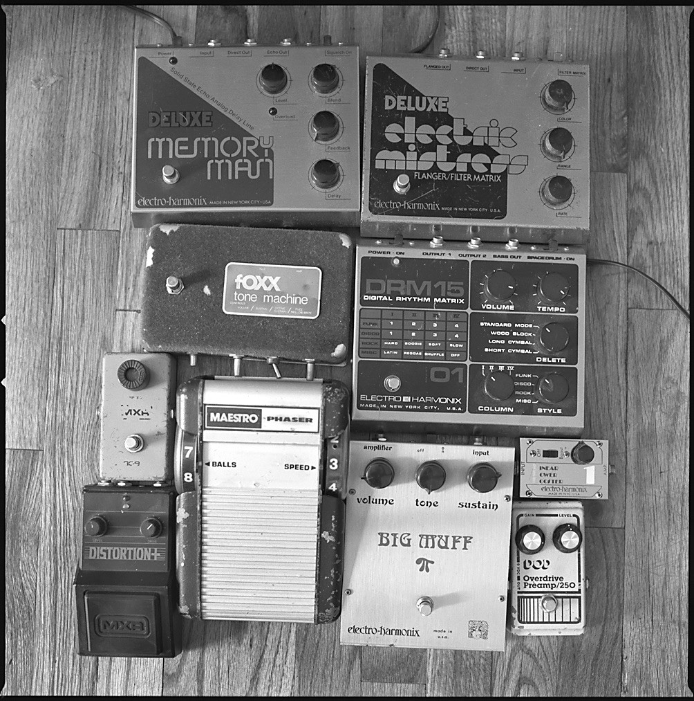 I would say the biggest problem is recording drums. I used to have a kit set up in the bedroom, but people started throwing beer bottles at my windows when I recorded them! One solution is recording drums somewhere else. The other solution to that was drum machines like my Korg ER1 and EA1, and Roland SP808. You can get really into drum machine programming. I also use a Suzuki RPM-40, which not a lot of people know about. It runs on batteries and it sounds amazing — I'll hook it up to a Digitech digital delay and put a tight delay on it, so it sounds like John Lennon, the Plastic Ono sound. You wanna hear it really quick? I bought it from someone through the classifieds at HarmonyCentral.com, which I like better than eBay for getting gear online.