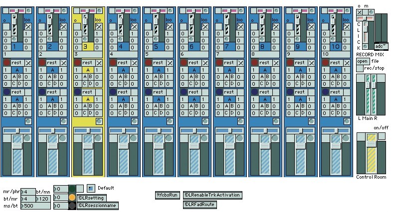 The software, which was created using Max/MSP (www.cycling74.com), is basically a multi-track phrase or loop sampler. It uses either the Mac's built- in audio jacks or an external card or interface box. There are ten mono tracks, each of which can play or record four phrases. So when one of the band members feels particularly inspired, he will plug in and start by playing his instrument along with the click track. It's always improvised. That person will play four variations (A, B, C and D) of a phrase, in groups of four measures, although the software can be set for a different number of measures. Then another person will go back and overdub four variations of another part, based on the previous person's work. So each track will record four loops, which the band will choose from later. As you can see, this creates many separate but intertwining loops, with the opportunity for many variations. This is how they create most, but not all, of their songs.