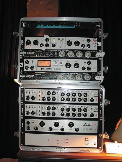 According to Dennis Herring, there is one person without whom Sweet Tea Studios couldn't function properly. Frank Lacy is a local technician and gearhead with a knack for building outboard gear to spec. His work may be little known outside of the mid-South, but he's highly valued among area studios such as Sweet Tea, Ardent, and Money Shot. "His stuff is great," Herring raved. "It's a big part of this place. I couldn't believe he was here. I moved here and started setting up, and I was thinking I needed somebody to be kind of a tech person to fix stuff, set stuff up. I called whoever was the head tech at Ardent [up the road in Memphis] at the time. And he said, 'You know, there's a guy living in Oxford now who's kinda Terry Manning's guy.' Herring was told he could probably track down Lacy at the University of Mississippi. He made some calls and found the best local resource he could imagine. "Frank's been an incredible ongoing resource," Herring said. "He's a tube inventor/builder type with complete technical skills. He can rework the 2" machine, he built all these mic boxes and wired the entire studio. But then, we've got maybe 20 pieces of his outboard gear." Among the Lacy pieces (they are labeled under two names — JFL and Lucas) at Sweet Tea are tube limiters, equalizers and preamps.