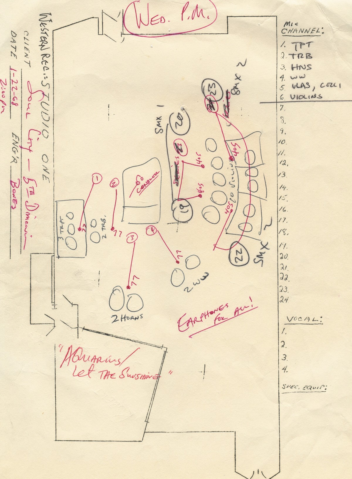 I'll tell you the story. The 5th Dimension were performing at the Americana Hotel in New York. We had been finishing the Stoned Soul Picnic record and I had to go back East to do vocals with them, which I did at Phil Ramone's studio in New York [A & R]. They said to me, "We saw this show called Hair and there's this song in it called 'Aquarius' and it's amazing. We want to record the song." They were on me. I said, "Okay. Let me come and see the show." I bought the Hair soundtrack album and I played it and I thought, "It's not a whole song." It's just an intro to the rest of the album. Part of the trick of producing these people was to say, "Yes" but put them off a little bit so that you could get your feet beneath you. They would come at me like banshees with these things. A lot of the ideas were really dumb songs that their friends had written or something. I was used to it by then. I started looking around and I discovered that there had been several releases of this song "Aquarius." Manfred Mann put it out and there were a couple of English groups that did it and a couple of American pop groups and nothing had happened. I thought, "The 5th Dimension doing this is not going to turn this into a real song." I went back to New York and we went to see Hair. In the show they did this tune called the "[The] Flesh Failures," which was a sixties, kind of downer song about how society has turned to shit. It was a protest song written for a show. Then this actor comes swinging through the theater on a rope and right at that point the rhythm changes and they start playing the last three bars of the song, which is "Let the sunshine in. Let the sunshine in — the sunshine in." I thought, "If I stuck that on the end of Aquarius and made it like a gospel thing, that would work." I had a meeting with them the next day. I said, "Here's what we're going to do." I played the album and told them that we're going to stick these two things together. They thought it sounded great and that they had gotten their way. I said, "Look, I don't know how, but when I'm done somehow we'll get these two things together." We went back to L.A. and we cut the track for the first part. We fooled around and fooled around and finally I said to [drummer] Hal Blaine [Tape Op #107], "What if you just play, [makes sound of the rhythm] 'dun dun dun, dun dun dun' and then we're into the track part of 'Let the Sunshine In' and when we get to the other one, at the end of 'Aquarius, Aquarius,' then you'll just [come in with the rhythm] and I'll just splice those two together when I'm finished with the vocals." We tried it and I put the two together. I recorded them in two pieces. I actually cut the multitrack together, I think, before I mixed. Somebody asked me once to re-create that mix and they brought an 8-track to the studio and I couldn't believe that I had done that record on 8-track. I thought it was a 16. That whole swirling intro thing at the beginning — we were in Vegas and we were finishing the Stoned Soul Picnic record. They were performing with Frank Sinatra. I'm getting in the elevator at Caesar's Palace, where they were performing, and in those days if the artist was a headliner in the showroom they put his records on and they played through the casino everywhere. I get into the elevator one night after doing vocals in the studio and I hear this swirling music in the elevator and I thought, "What is that? That could be the intro to 'Aquarius'!" It keeps swirling and swirling and finally Frank sings, "We're lost out here in the stars. Big stars. Little stars. [from "Lost in the Stars"]" I thought, "That's The Concert Sinatra record." I ran upstairs and I called [horn and string arranger] Bill Holman on the phone and I said, "I got the intro to 'Aquarius.' Go out and buy this record. I want something swirling like that with flute and percussion and strings." I don't know how these things happen — they just happen to you if your ears are open and your head is open.