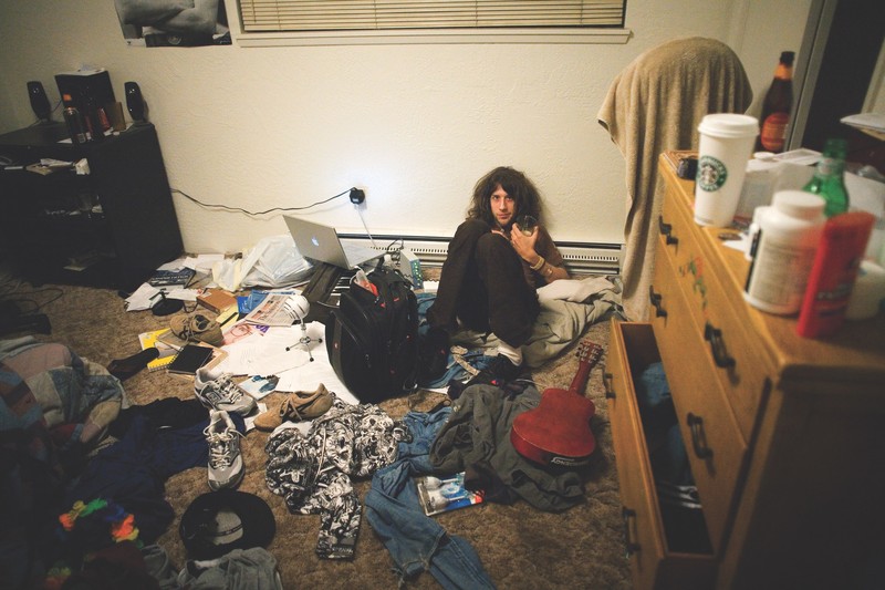 My setup was humble. My laptop and a mic. I used [Apple's] GarageBand, and the mic was a Blue Snowball [USB-powered]. But finding a space was often impossible. Sometimes I'd have to retreat to bathrooms, just to get away from music blasting or people talking — to be able to commit my song to tape. Maybe time would get the better of me, and it'd be three or four in the morning before I'd finish writing the song, and I'd be at some stranger's house. I'd have to sing the song as quietly as I possibly could into that microphone, or risk waking up my gracious host who's sleeping in the next room. A lot of the songs are sung in whispers like that, but that's not an aesthetic decision you're listening to, it's a logistical necessity.