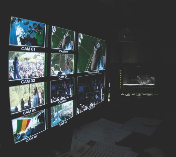 Shows weren't without problems, and being part of a good crew helped solve those inefficiencies quickly. Some of the festivals took place at remote locations — on the side of the Eel River, in the desert of Joshua Tree or, for instance, next to the Pacific Ocean in Boonville — and this meant that getting any parts or technical support would have been impossible. Having a good set of all types of audio connectors, y-cables and extra microphone cables (long ones) lessened the stress. On one show I realized the snake was sending a time code bleed into the rack, so I had to run 150 feet of microphone cables to the mix position. Loads of extra mic cables are a must! A few times I had to run onstage to adjust a bullet camera or help pull cables, and other times I manned the director's chair and did some mixing of the cameras, which isn't as easy as it may look!