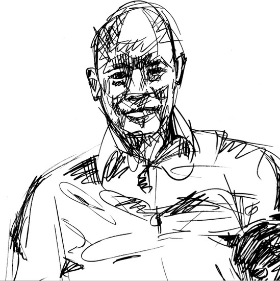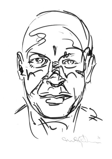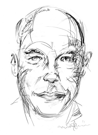 It turned out to be a lot harder than I thought. My friend Miles Hermann did about 8 or 9 different portraits but felt like he hadn't quite hit it right. "Everytime I felt I was getting close, I'd go a little further and it felt like I lost it." I suggested Miles try a few more, but stop as soon as he began to feel he was in the ballpark, kind of the art equivalent of resisting the urge to add another overdub. Nonetheless, I really liked one of the portraits Miles did even if it was not quite what I had in mind. This is the one we ended up using in the article: