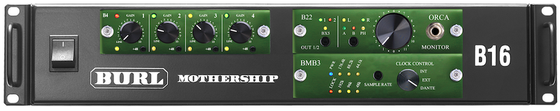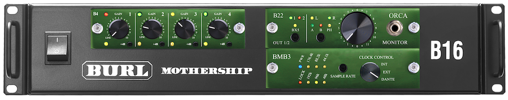 This B16 Mothership Solution is designed for high-end home recording. It features the B4 MIC / LINE ADC Daughter Card with 4 analog inputs, and the B22 ORCA Daughter Card with 2-channels for mixing/mastering and a 2-channel monitor section. This solution utilizes the BMB3 with Dante audio-over-Ethernet connectivity.