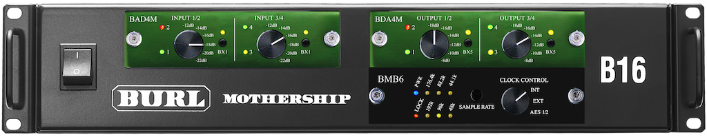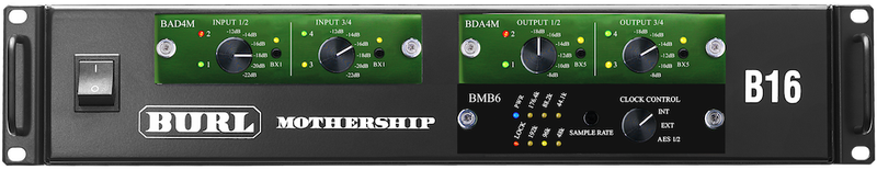 This B16 Mothership Solution is an example of a BURL Professional Mastering configuration featuring the BAD4M for 4-channels of analog input and a BDA4M for 4-channels of analog output with switchable transformers and adjustable analog attenuation. This solution utilizes the BMB6 Motherboard with AES/EBU connectivity.