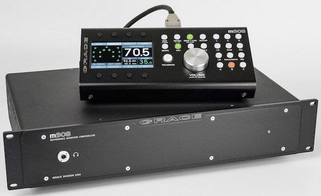 The m908 is a fully self contained plug and play monitor controller, with a full complement of monitoring features including cue channels, built in talkback mic, mono, mute and dim controls, and an exhaustive list of functions relating to surround and immersive playback systems. It is designed to enable professionals and facilities to update their workflows for immersive audio playback with a minimum of effort and cost.