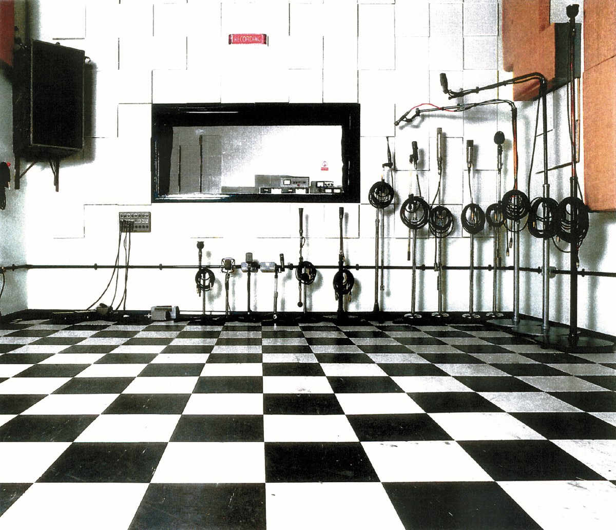 The studio room (see picture) is 17ft by 14ft with an 11ft high ceiling and nifty retro-style black-and-white-squared lino floor. Straight away I was reminded me of how I imagine an EMI studio might have felt in the mid-1960s. I was half-expecting to hear one of those stereotypical white-coated studio boffin on the talkback any second: "That's a take, boys!". That feel is captured so well that two film crews have recently been in to shoot sequences amongst the authentic period studio fittings. A large retro "Recording" light above the window into the control room is a nice touch and a collection of vintage condenser mics is arranged along one wall. Outside in the hallway there is a wonderful selection of valve guitar amps, an old tone wheel Hammond L102 and a Vox Continental organ, the latter as used by legendary garagepunkers, ? & The Mysterians on their recent London visits.