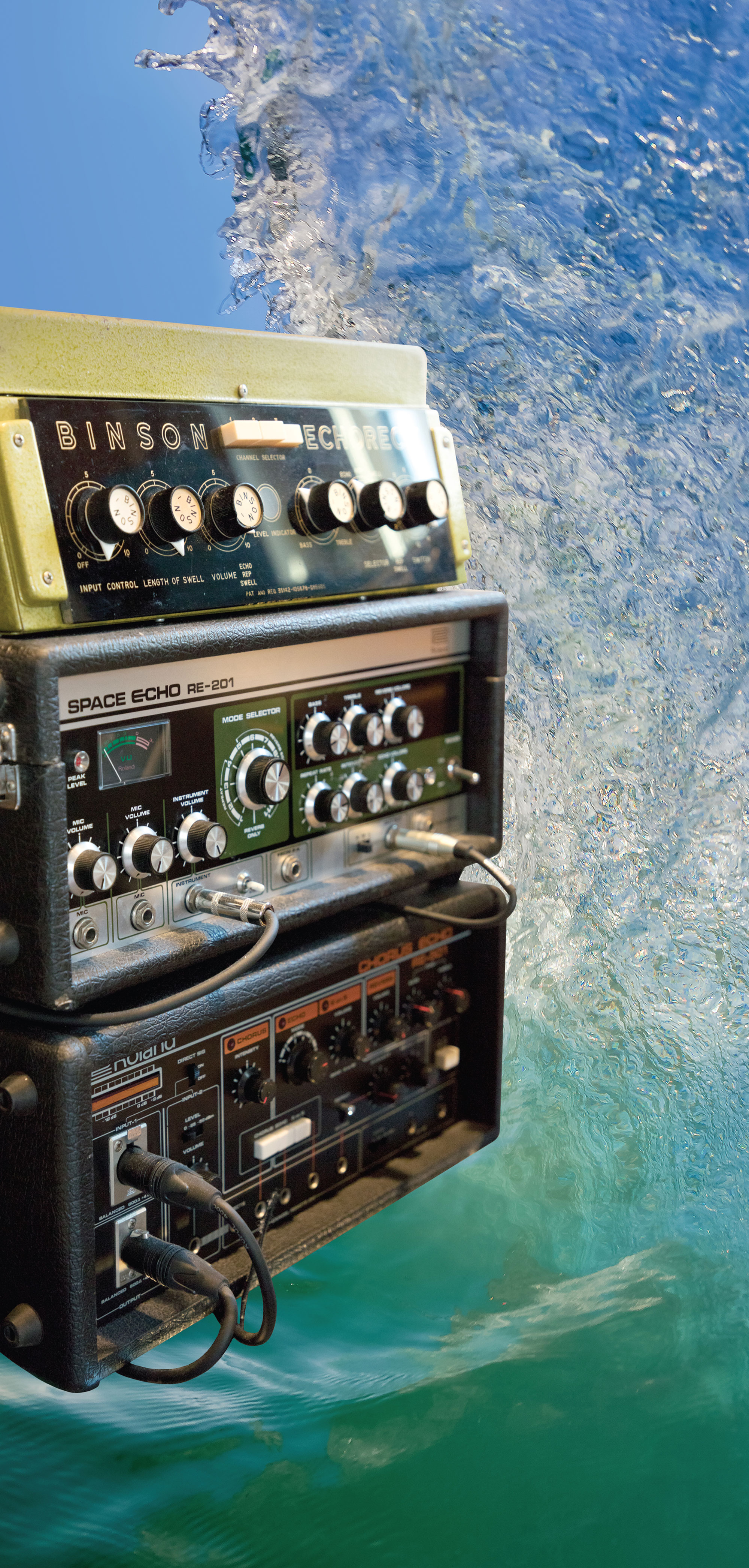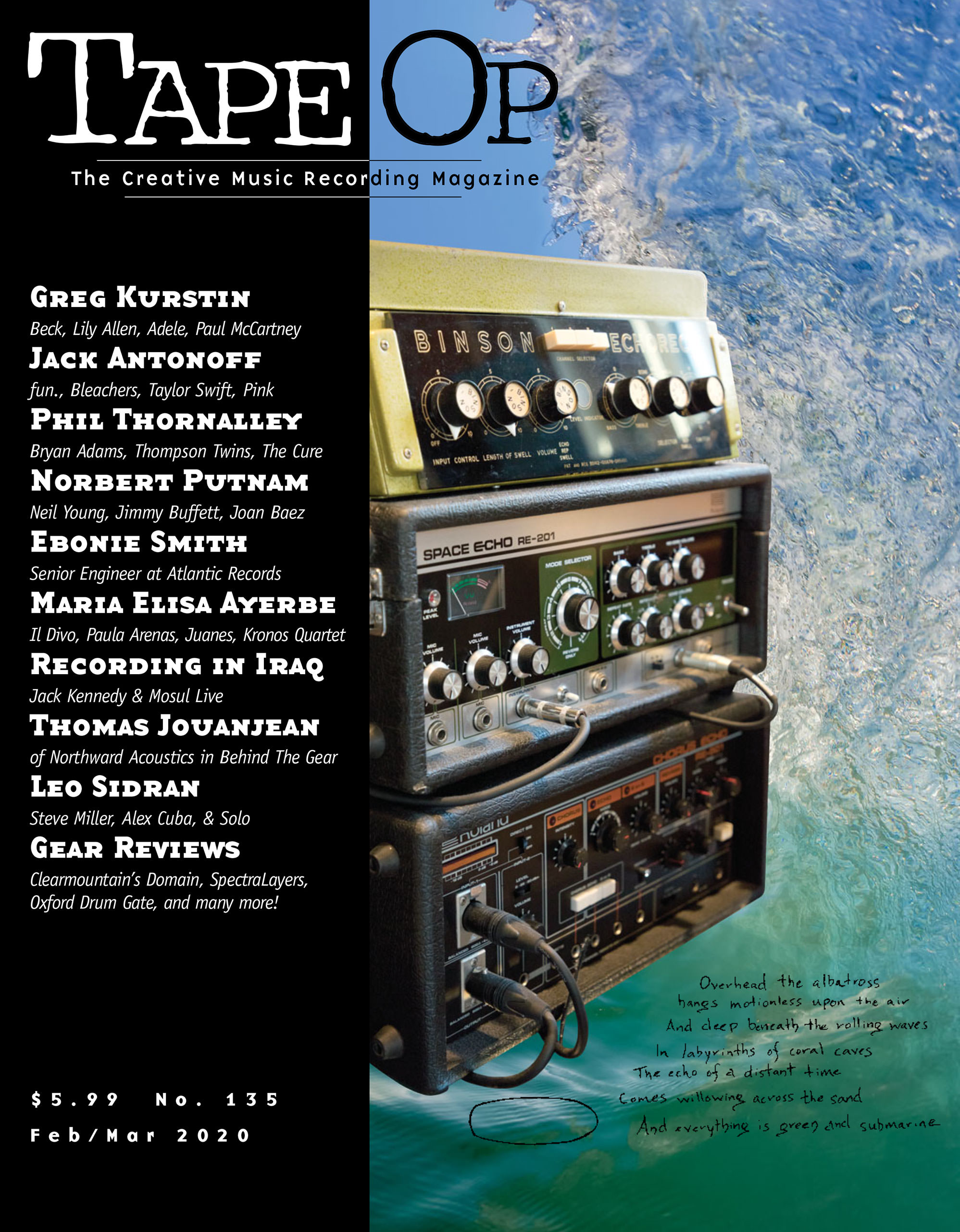This issue's cover is an homage to the Pink Floyd song "Echoes," from the album Meddle. The idea came to me after I saw Brian T. Silak's photo of Jack Antonoff's vintage tape delays, as the Binson Echorec features prominently in that track. "Echoes" was also used as the soundtrack in the classic surf film Crystal Voyager, in which the last 23 minutes of the film is footage of seminal surfer George Greenough riding inside the tube with this track as the score, hence the wave photo. The text was lettered by Bobby Lurie and is the first verse of the song, written by Pink Floyd (Gilmour, Waters, Wright, Mason) and published by Warner/Chappell Music, Inc. -JB