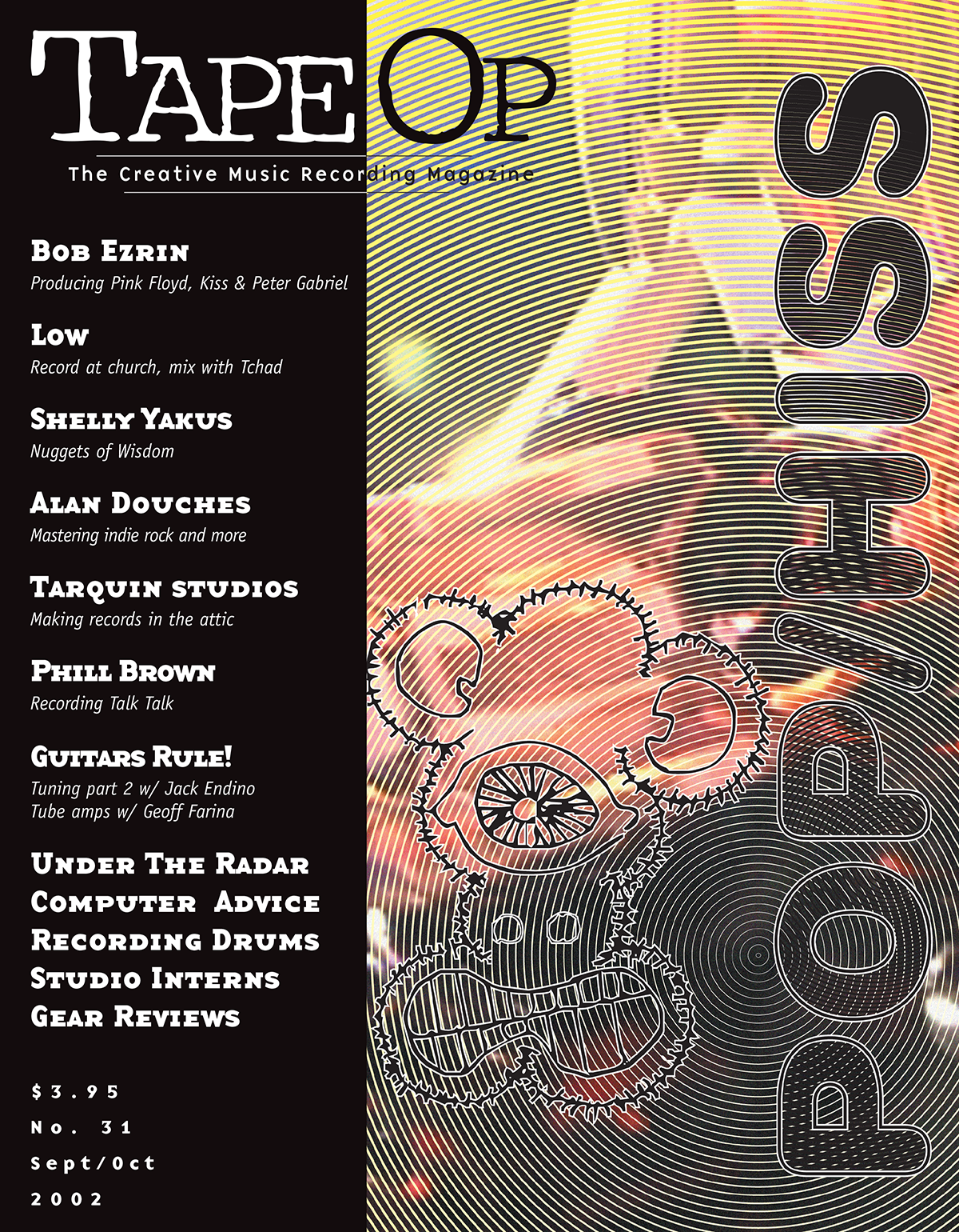 It's the end of summer, so why have I spent so much time indoors? Making records (check out the new Sleater-Kinney, One Beat, dammit), buying and remodeling a house, moving, going to weddings, editing a magazine, driving to Seattle to see Mission of Burma (thanks to Bob Weston) — so much stuff eats up my time. Speaking of that, I may have a bit more free time now that Andy Hong (aka "The Gear Geek") has agreed to take over as "Reviews Editor" of Tape Op. His reviews have been among the finest that we've run, he's always abreast of new recording technology (uhhh, not my strongest trait), and I think he'll do a great job of it. It would be nice to have a day off sometime soon though. I'm trying to work more freelance engineers into my studio to open up my schedule a bit, so wish me luck. I've heard horror stories of "studio burnout" and I'm trying to steer clear! By the way, it looks like we are doing the Second Annual Tape Op Conference next year here in Portland, Oregon on May 30-June 2. Look to www.tapeop.com or our new conference website www.tapeopcon.com for the most current info. Craig Schumacher of WaveLab Recording is now our man-in-charge of the Conference, so wish him luck and buy him a beer next year! -Larry Crane