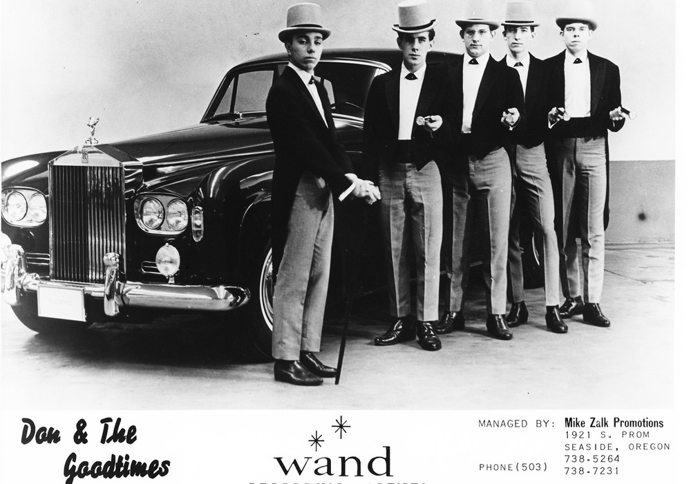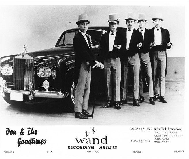 It was actually from a girl in my social studies class who was just a livewire! I told her I'm starting this band and we're looking for a name. She said, "You guys are the Good Times." I went to Gallucci and he said, "That's great." One Saturday morning we got in the car and drove up to Seattle to Kearney Barton's studio, Audio Recording. We did a cover of a song that had been recorded by a local group and was getting some notoriety called "The Turn On Song." It was an instrumental — we recorded that and a throwaway b-side and drove home. Gallucci arranged the recording session with Jerry Dennon of Jerden Records. He had done the original Kingsmen recordings. This was the summer between high school and college. I had a summer job doing machine shop work and I remember sitting in my mom's Cadillac eating my lunch listening to KISN in Portland when I hear "The Turn On Song" by Don and Goodtimes and I about had a cow. We went on the road backing up this record and got some local airplay! We were an interesting band because we had these R&B roots but at the same time we realized that kids really liked show bands — like Paul Revere & the Raiders — so we amalgamated the two. The guitar players did steps, I was the MC between songs — if a guitar player broke a string, we got the patter out. I'd talk to kids in the audience and give away some prize. Never a dull moment!
