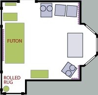 Here's what I did in my living room. Equipment racks, large tape machines, and tall shelves are pushed into the corners. I found some surplus acoustic foam and placed it on one wall. I attached remnants of a shag rug on the opposite wall and covered the ugly rug with a curtain. A heavy cotton futon pushed against the wall with the largest unbroken span makes a great bass-trap, soaking up unwanted bass resonance.