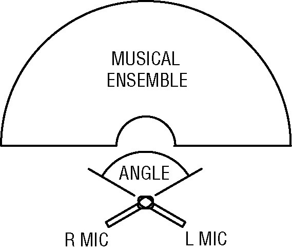 With the coincident-pair method (XY or intensity stereo method), two directional mics are mounted with grilles nearly touching and diaphragms one above the other, angled apart to aim roughly toward the left and right sides of the ensemble or instrument (Figure 2). For example, two cardioid microphones can be mounted angled apart, their grilles one above the other. Other directional patterns can be used, too. The greater the angle between microphones, and the narrower the polar pattern, the wider the stereo spread. A typical angle is 90 to 120 degrees.