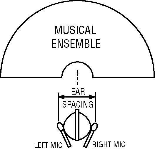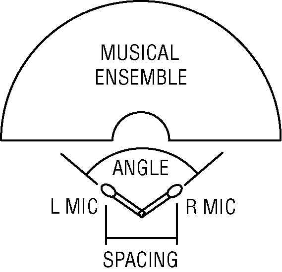 With the spaced-pair (or A-B) technique, two identical mics are placed several feet apart, aiming straight ahead toward the musical ensemble or instrument (Figure 4). These mics can have any polar pattern. The greater the spacing between mics, the greater the stereo spread.